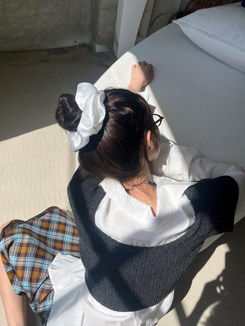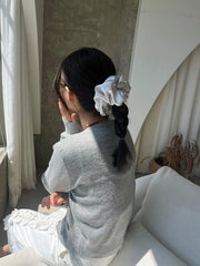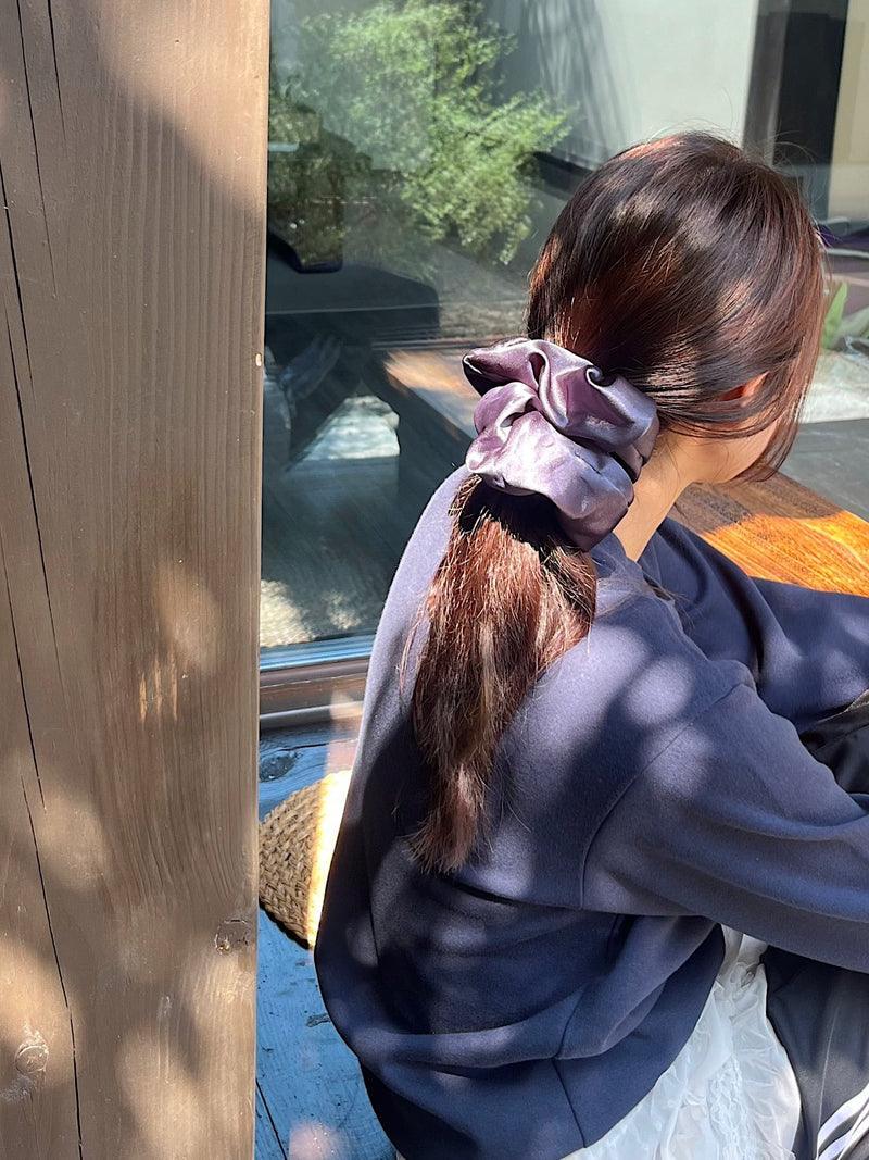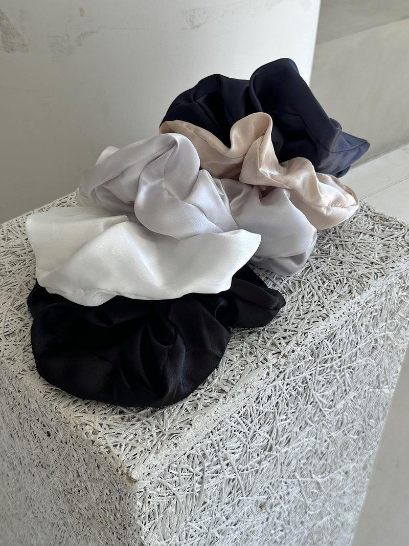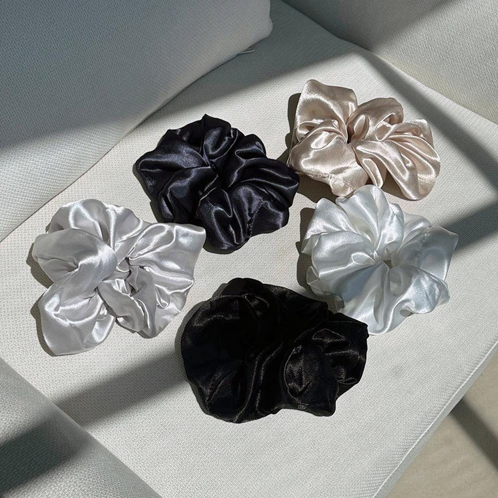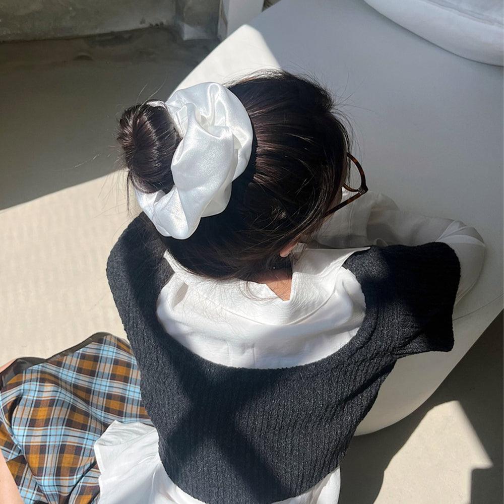 - A big size scrunchie that can be tied twice for a relaxed look, making it a surefire focal point for a simple outfit.