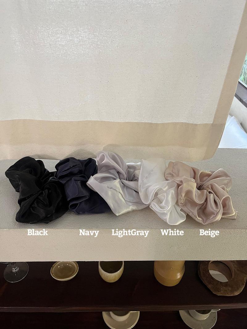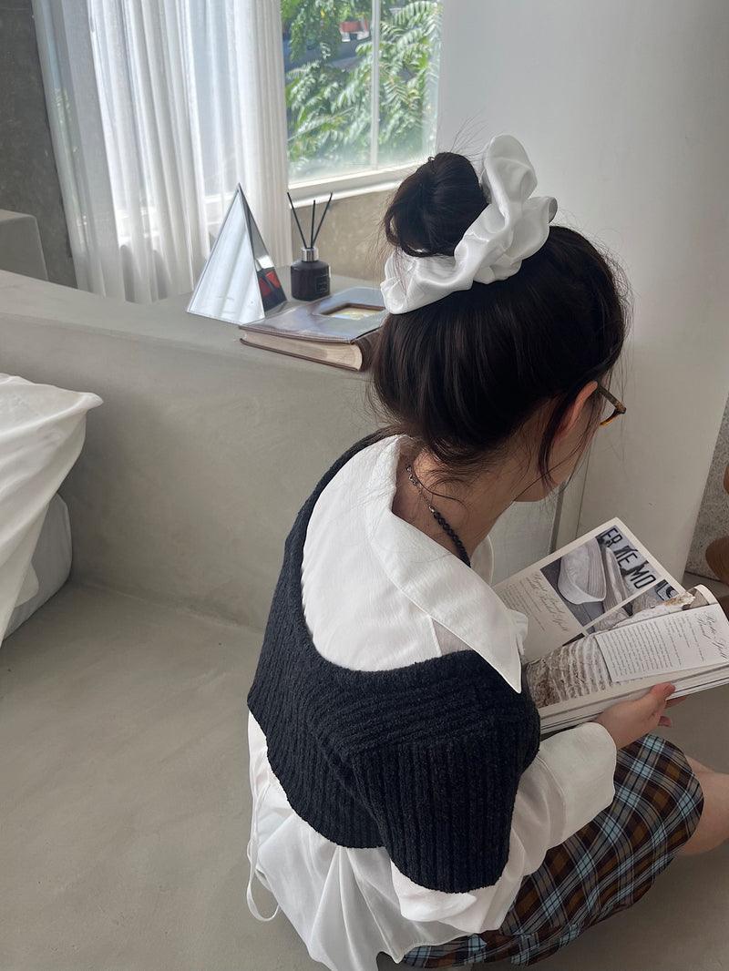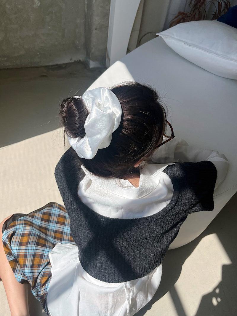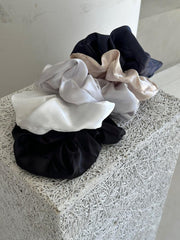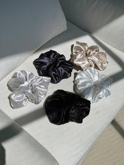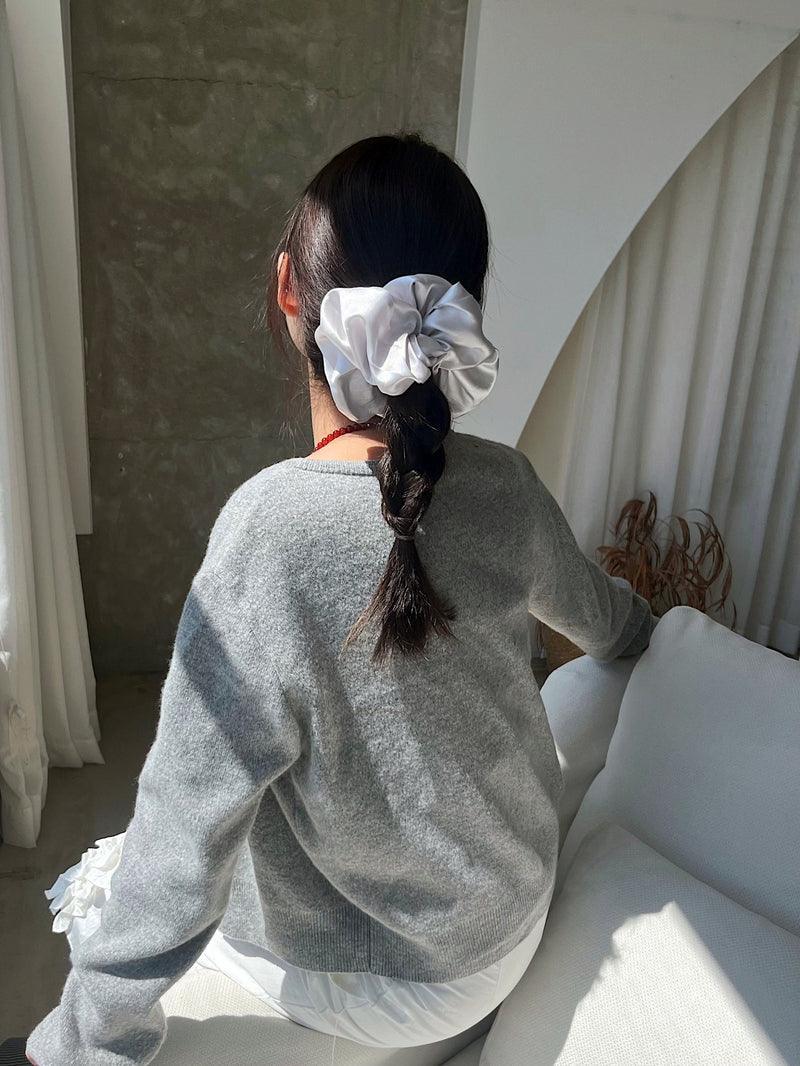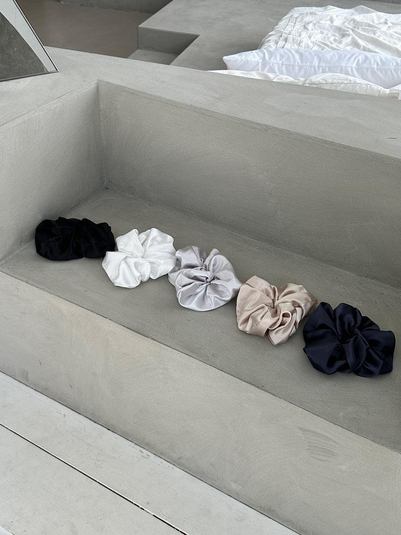 - A big size scrunchie that can be tied twice for a relaxed look, making it a surefire focal point for a simple outfit.