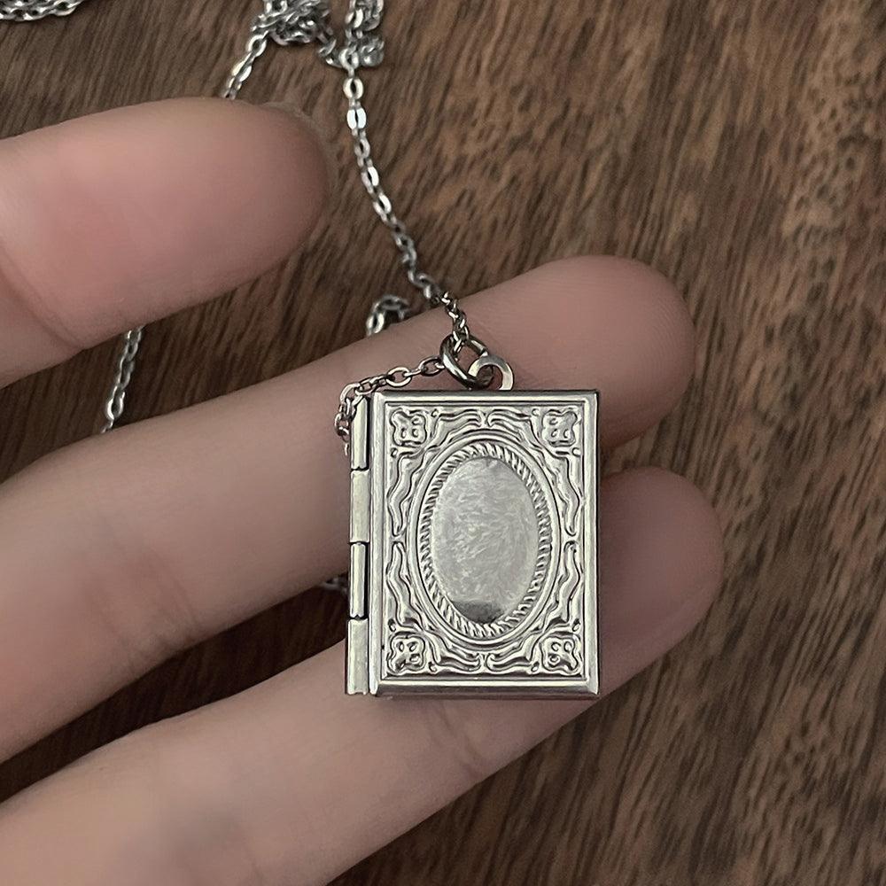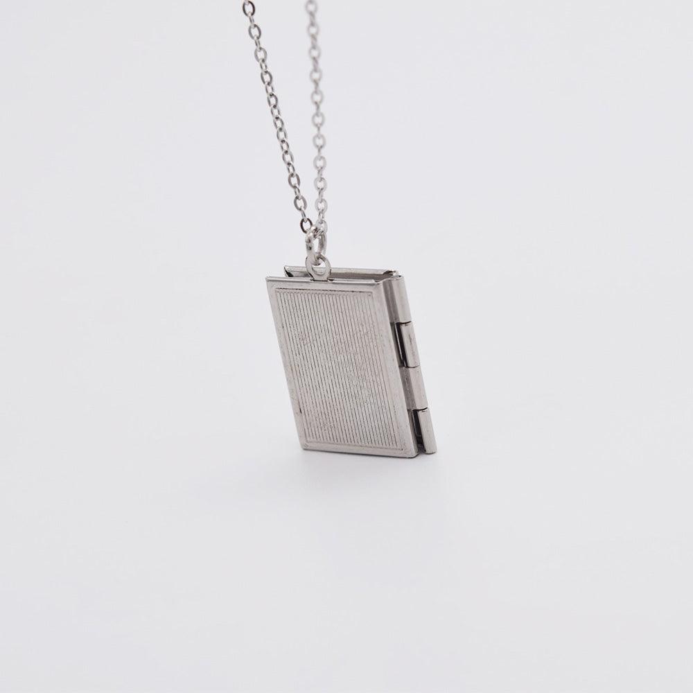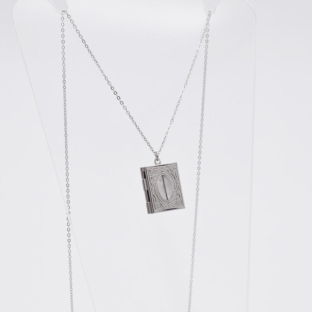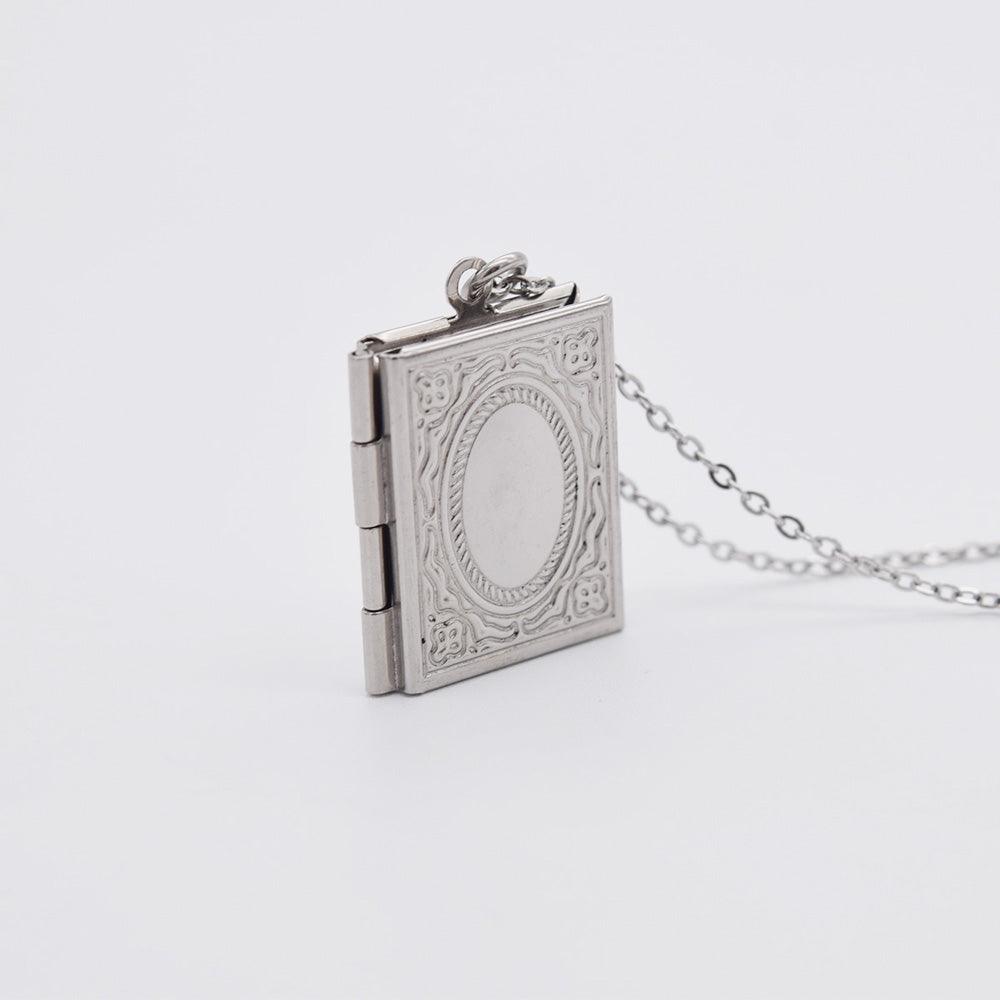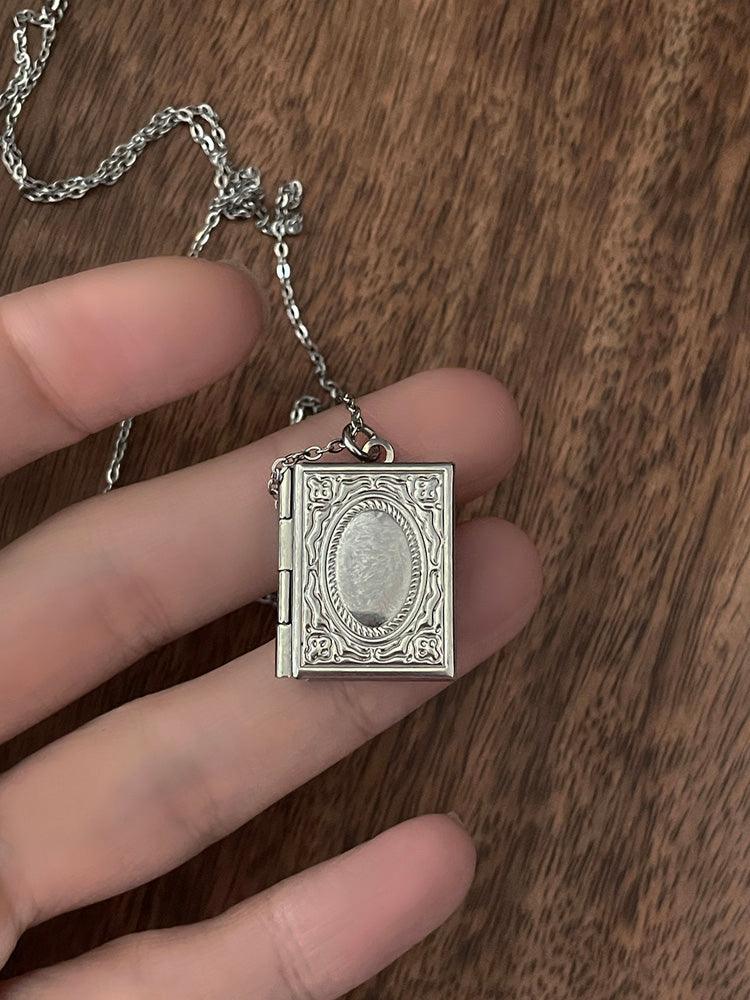 This necklace features a locket pendant that opens up into a book and allows you to place a photo inside.
