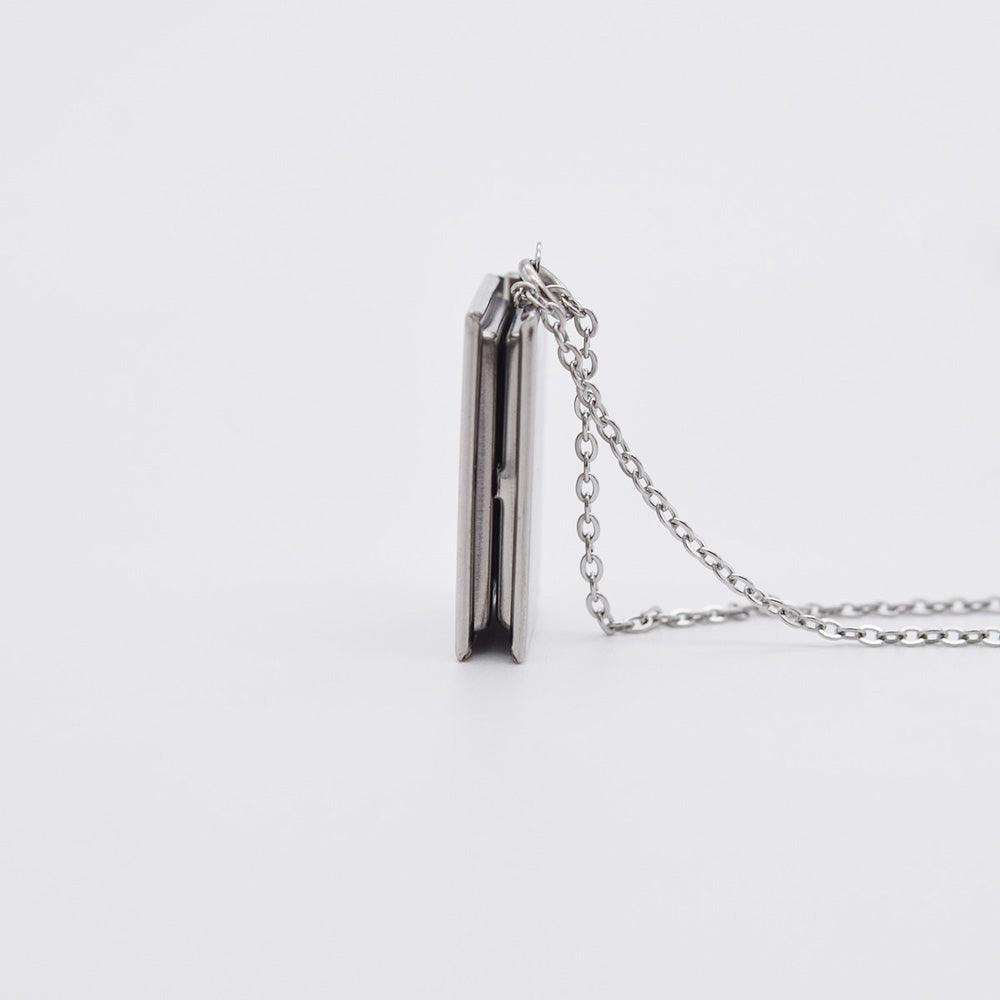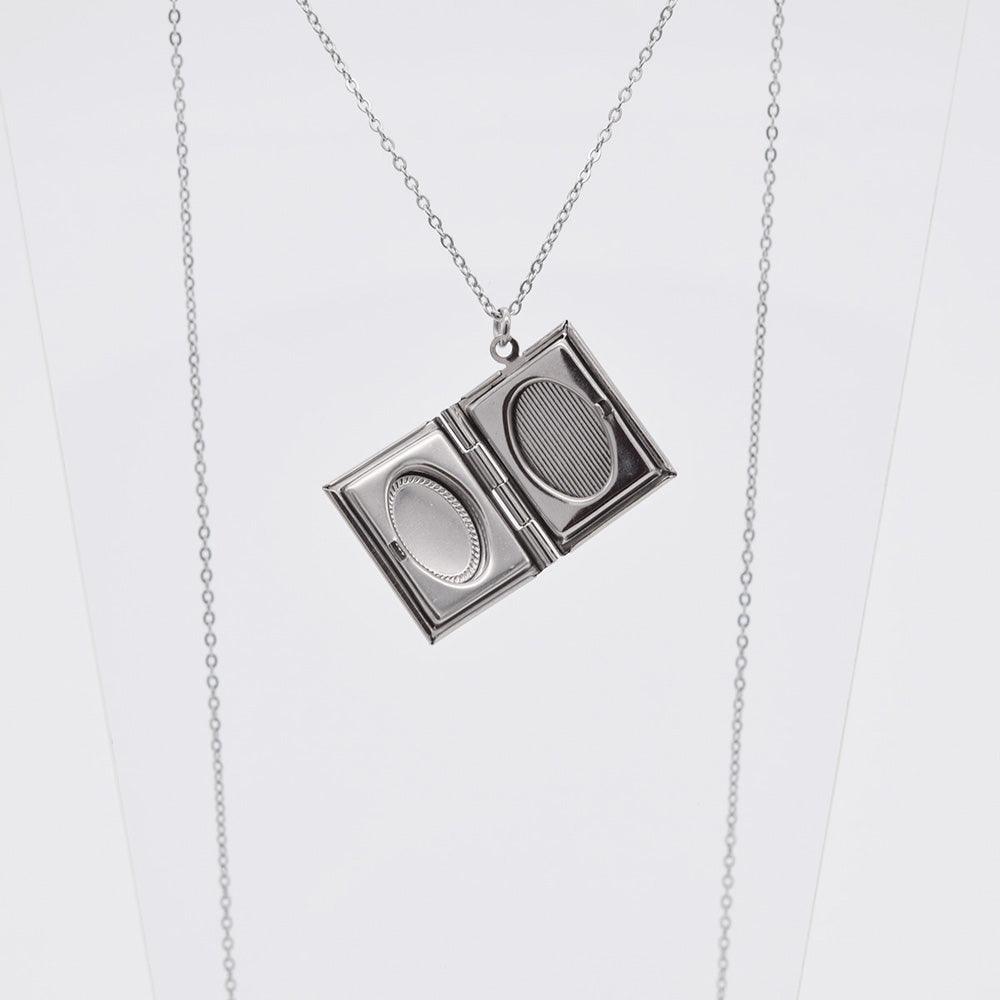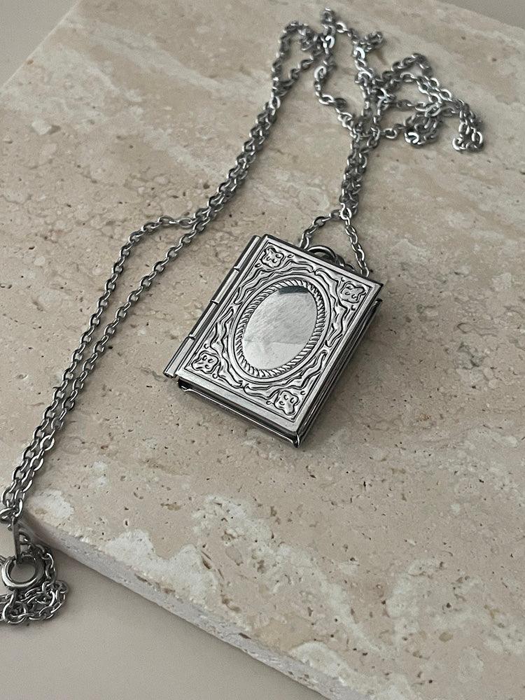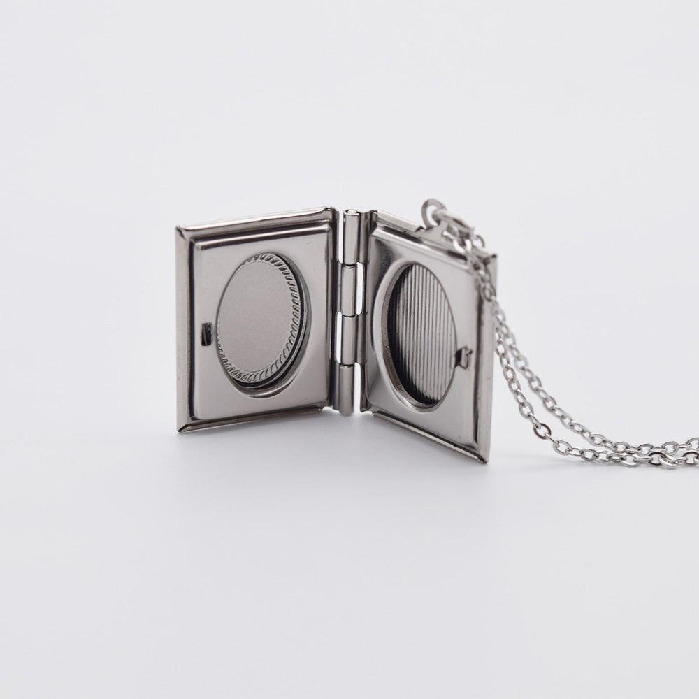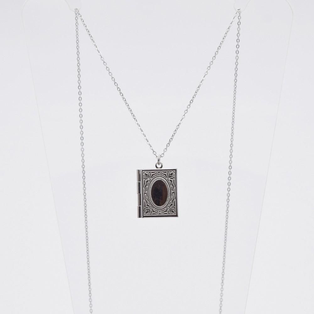 This necklace features a locket pendant that opens up into a book and allows you to place a photo inside.