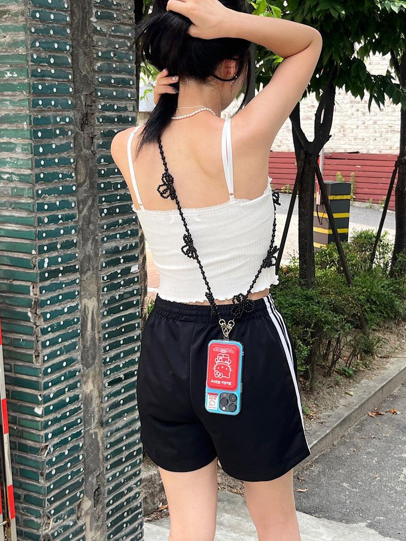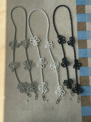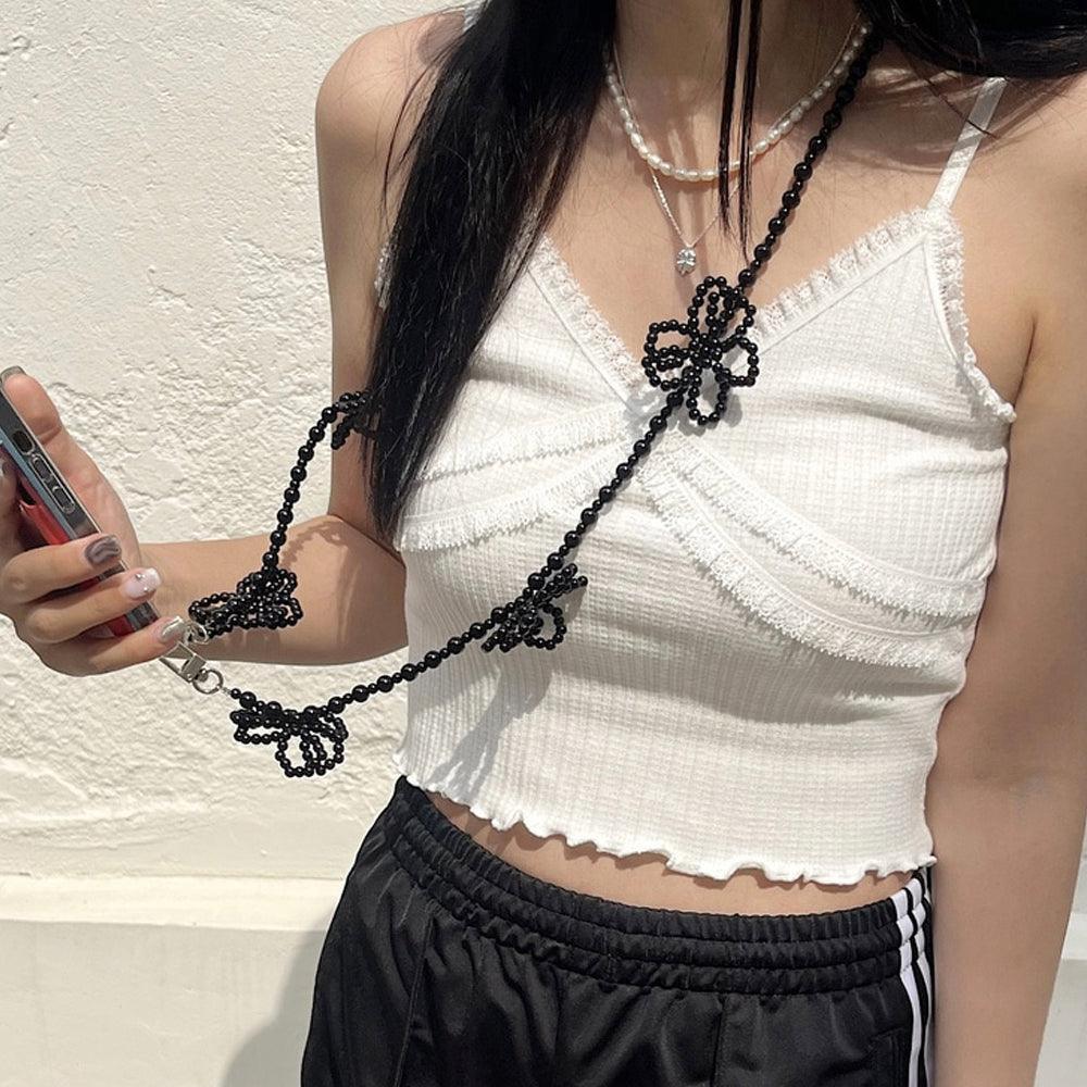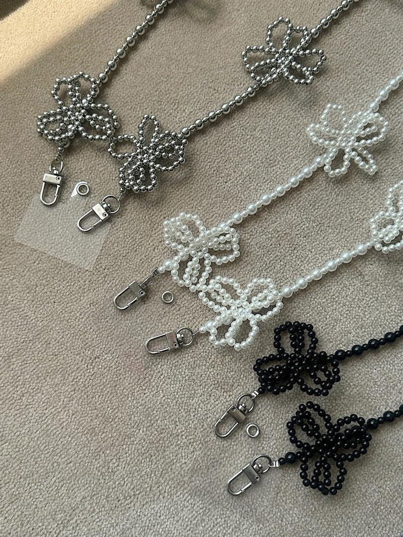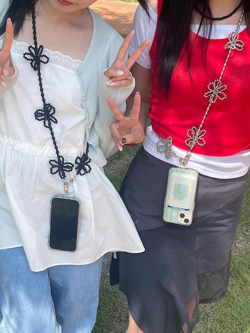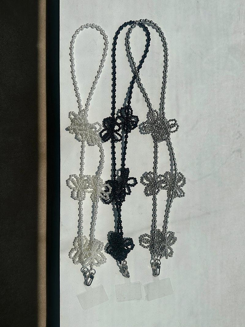 - A smartphone strap that can be hung in a cross shape using long flower point beads