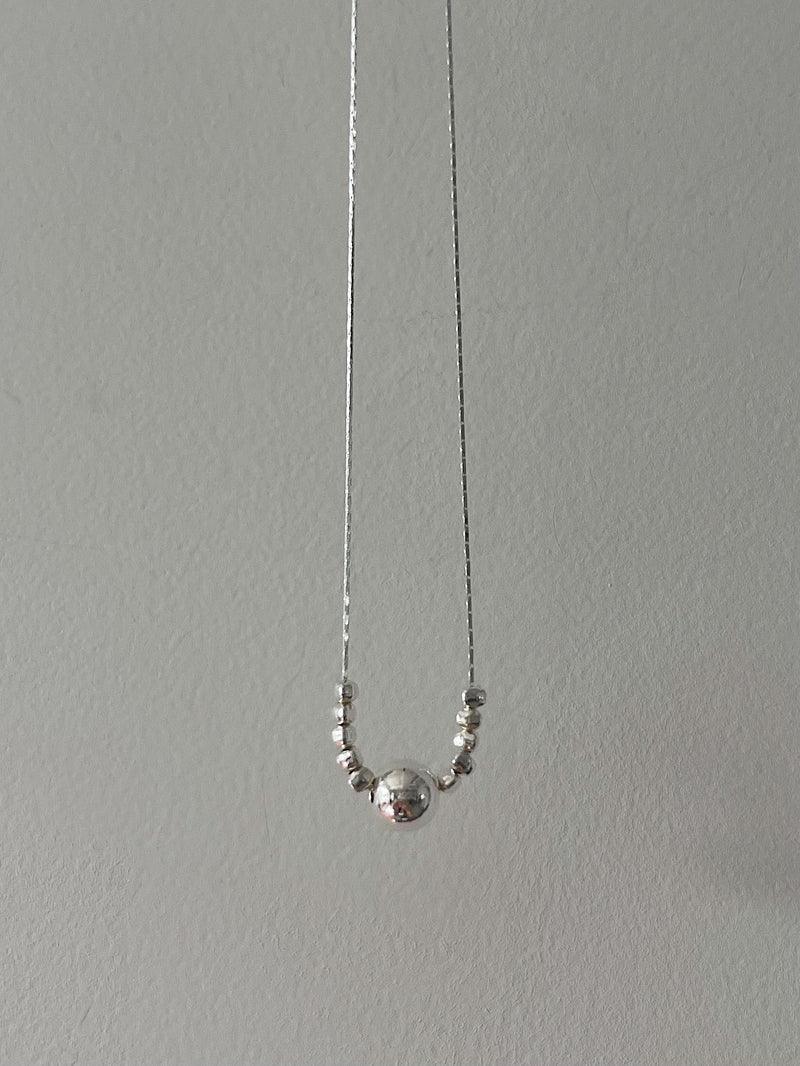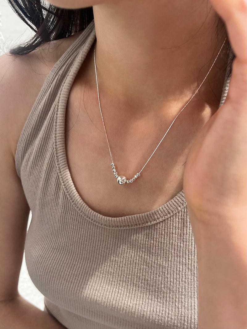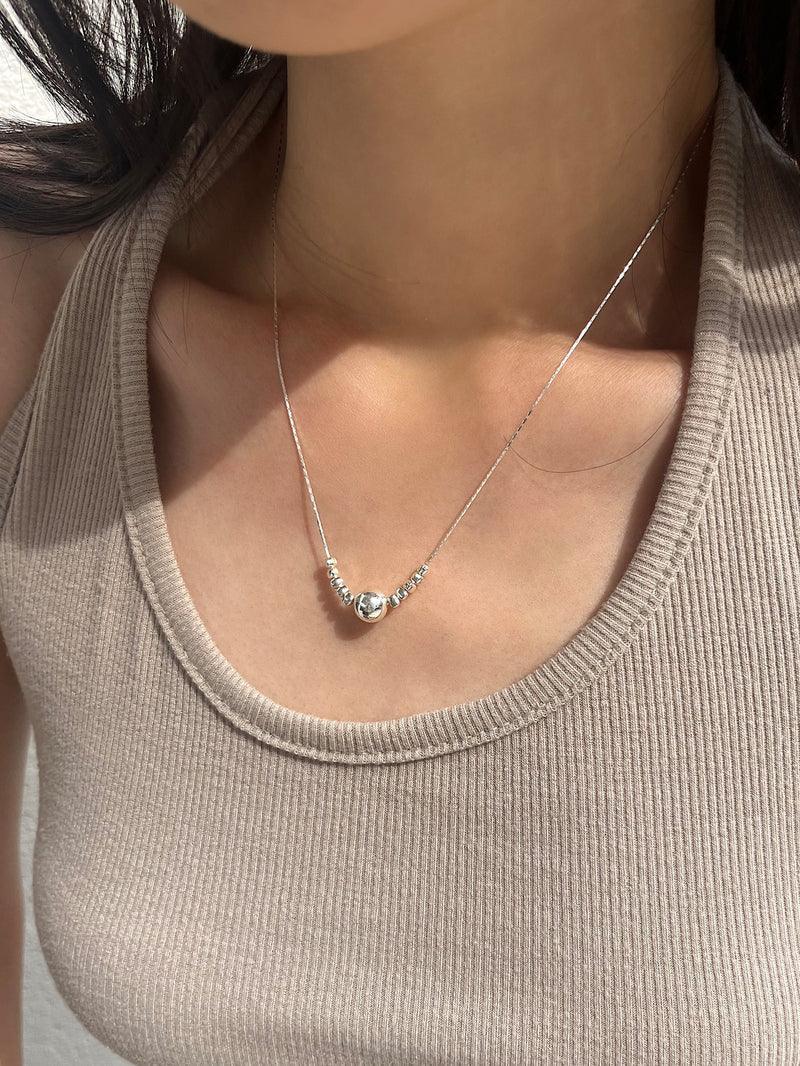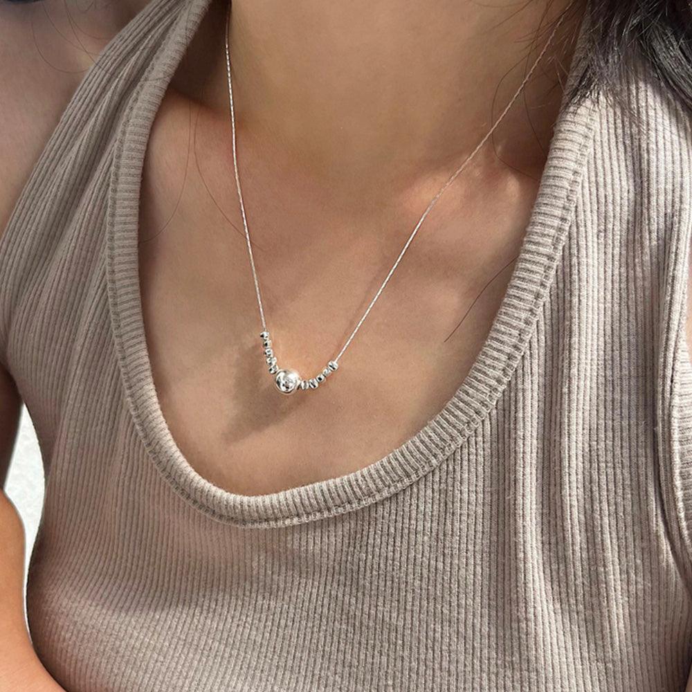 - A unique necklace design with small pebble-shaped balls on the central ball side.