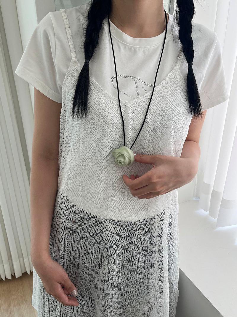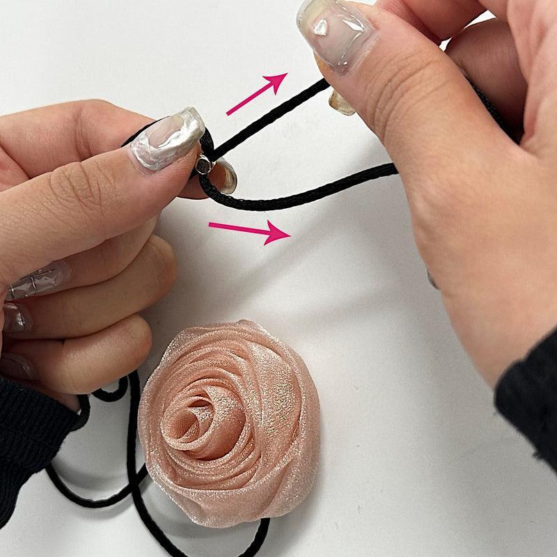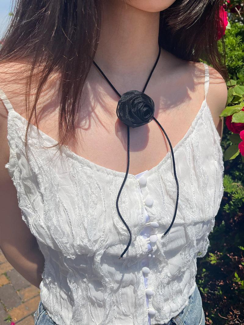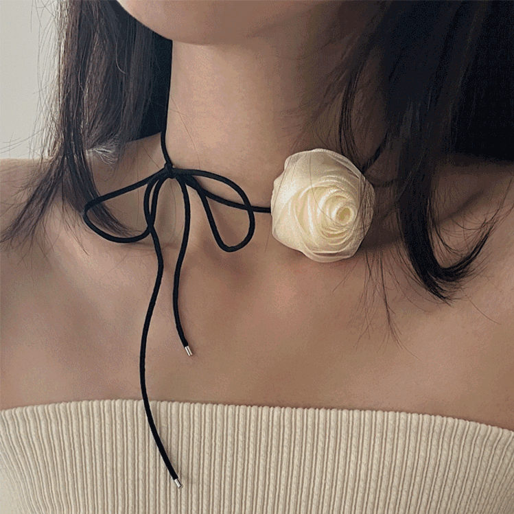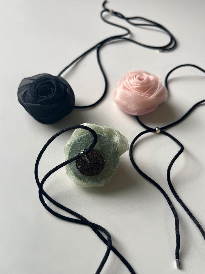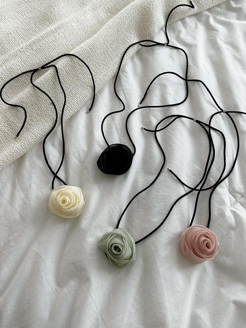 - Rose corsage necklace with subtle pastel colors and sheer texture
