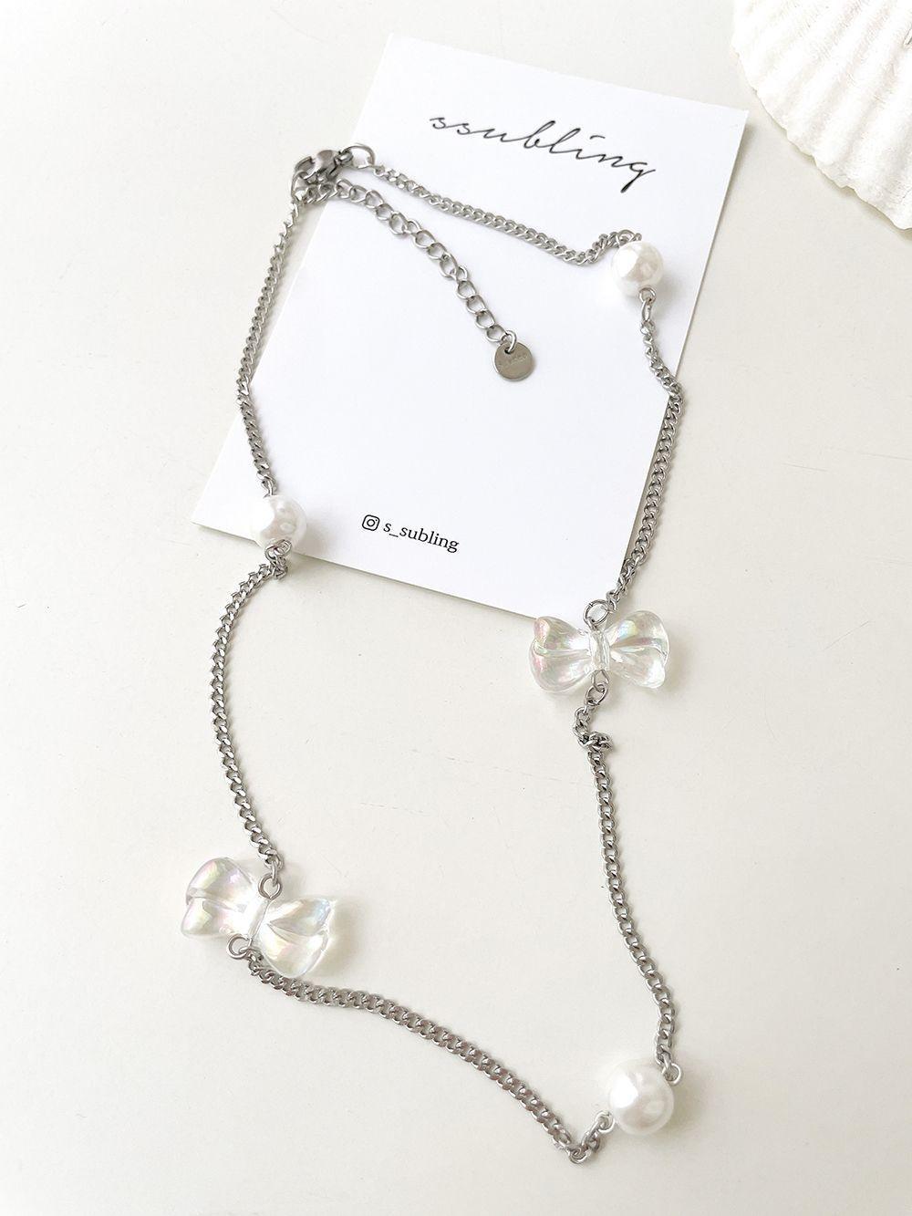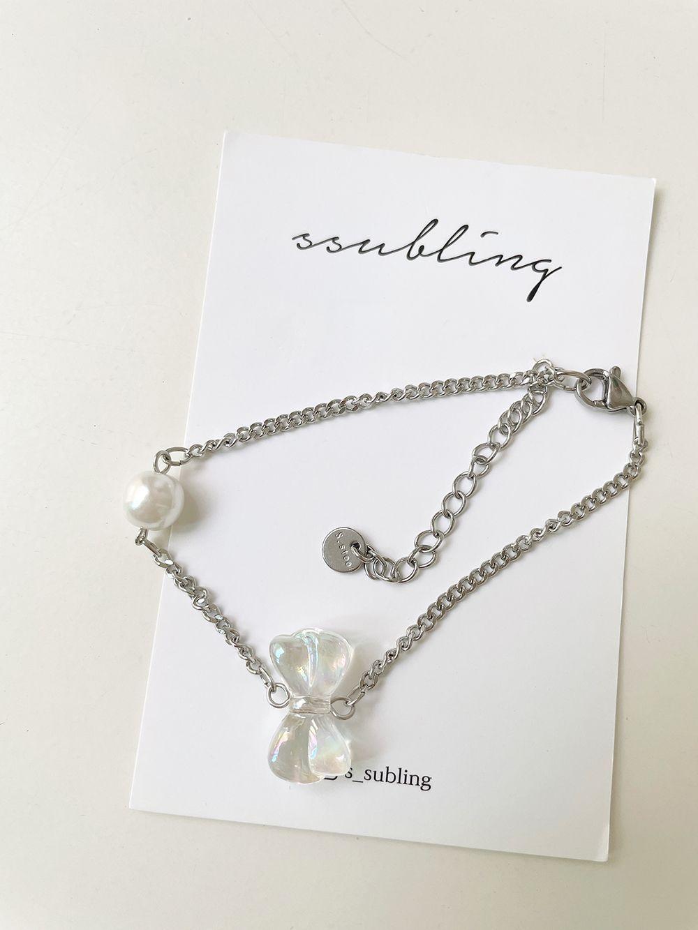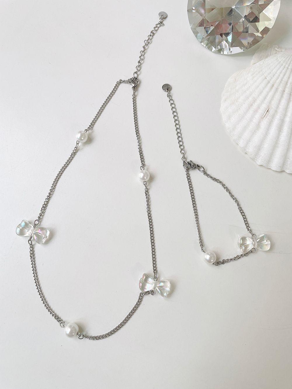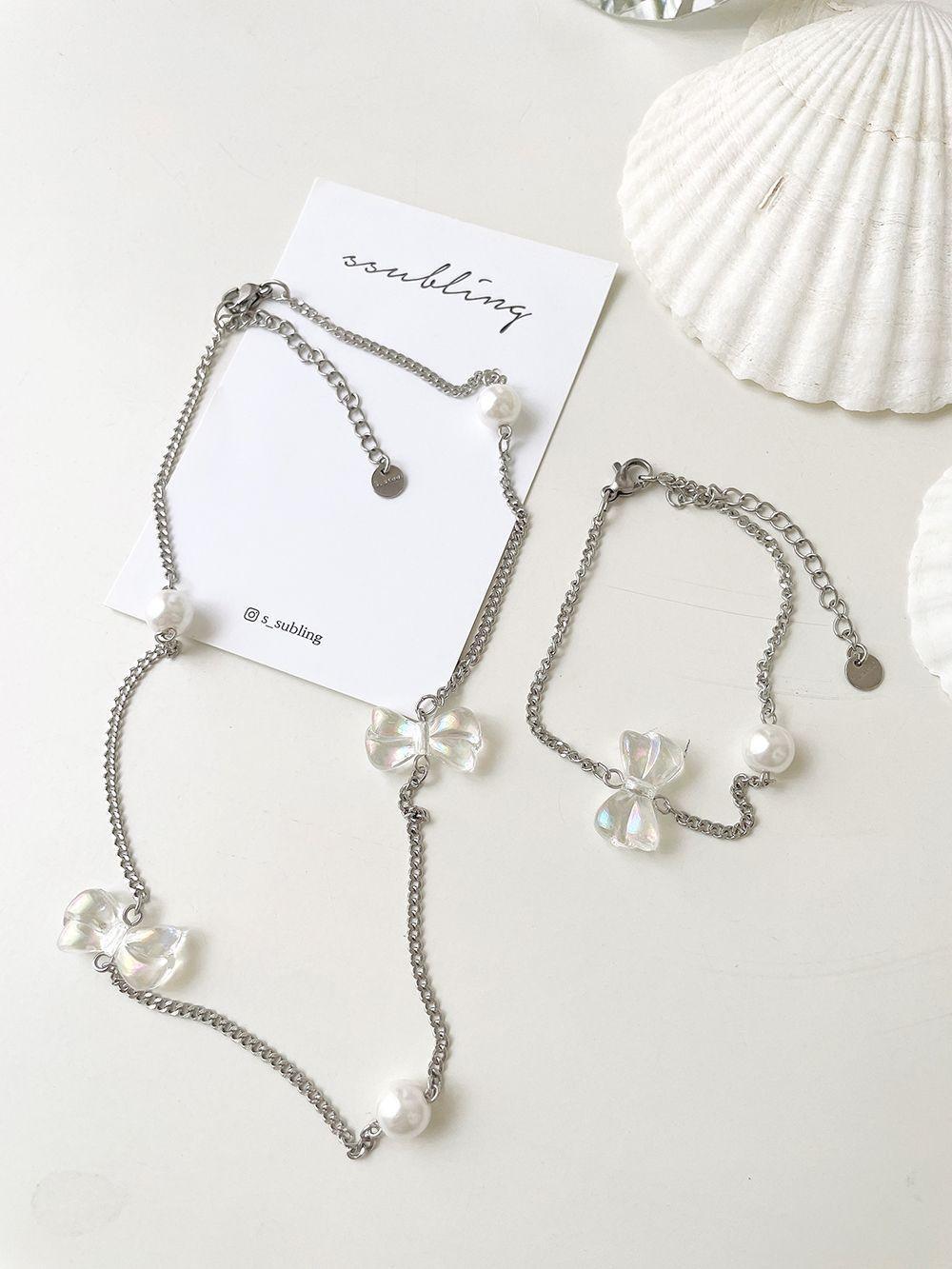 It's a necklace and bracelet with a cool design featuring a surgical steel chain and acrylic ribbon and pearls in the middle :)