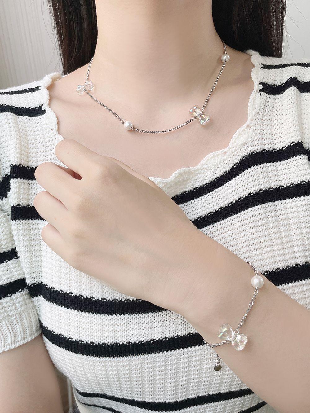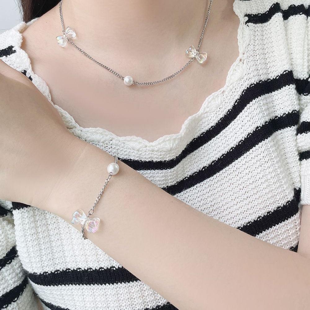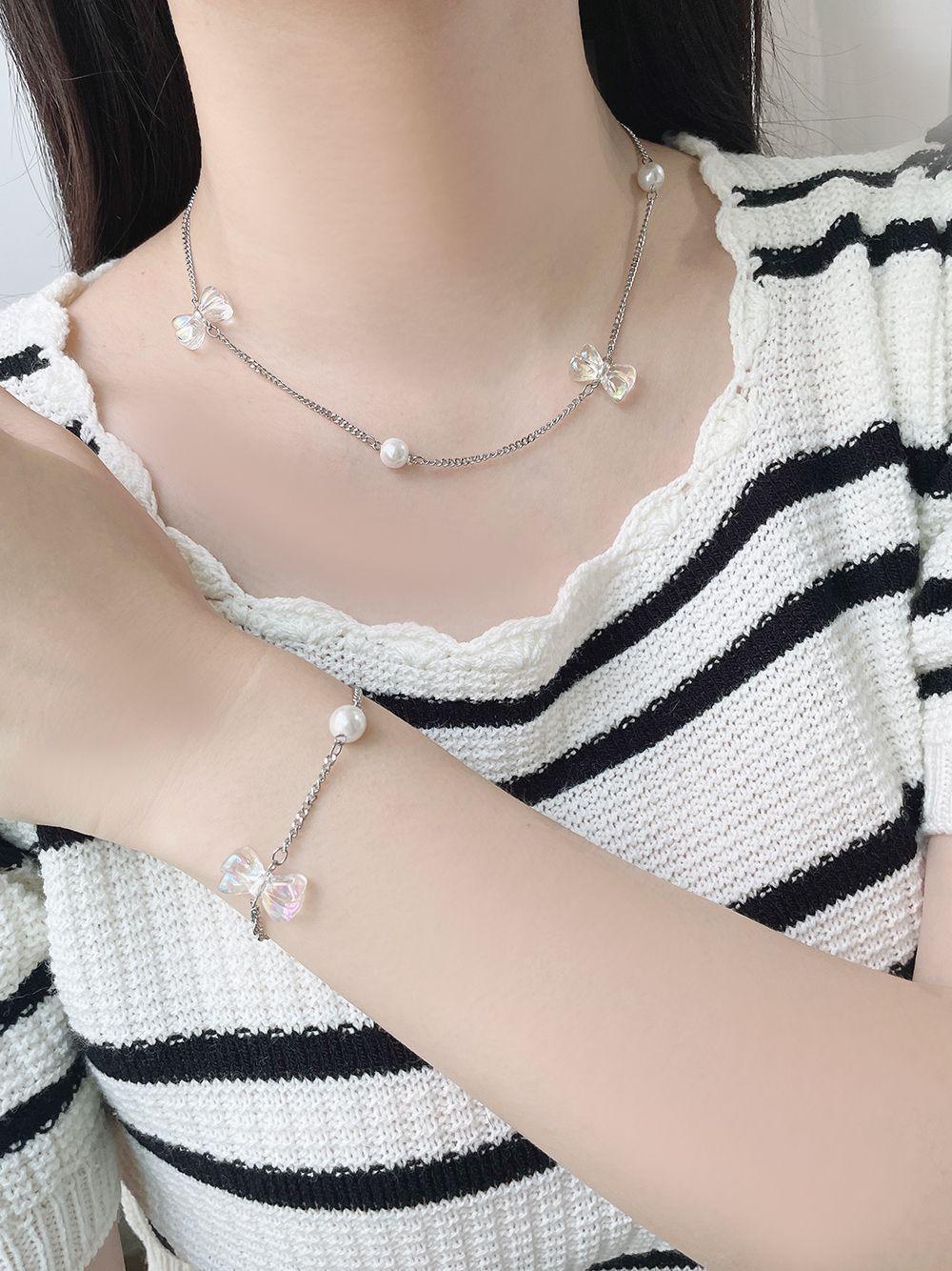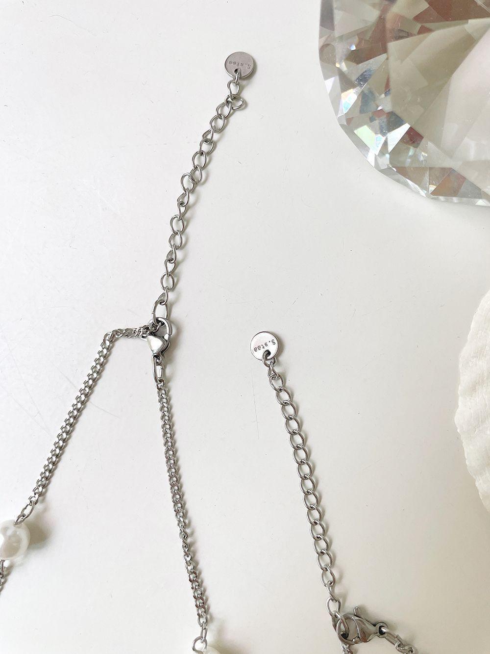It's a necklace and bracelet with a cool design featuring a surgical steel chain and acrylic ribbon and pearls in the middle :)