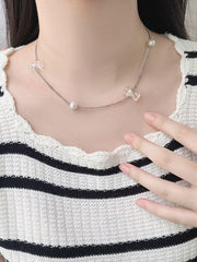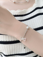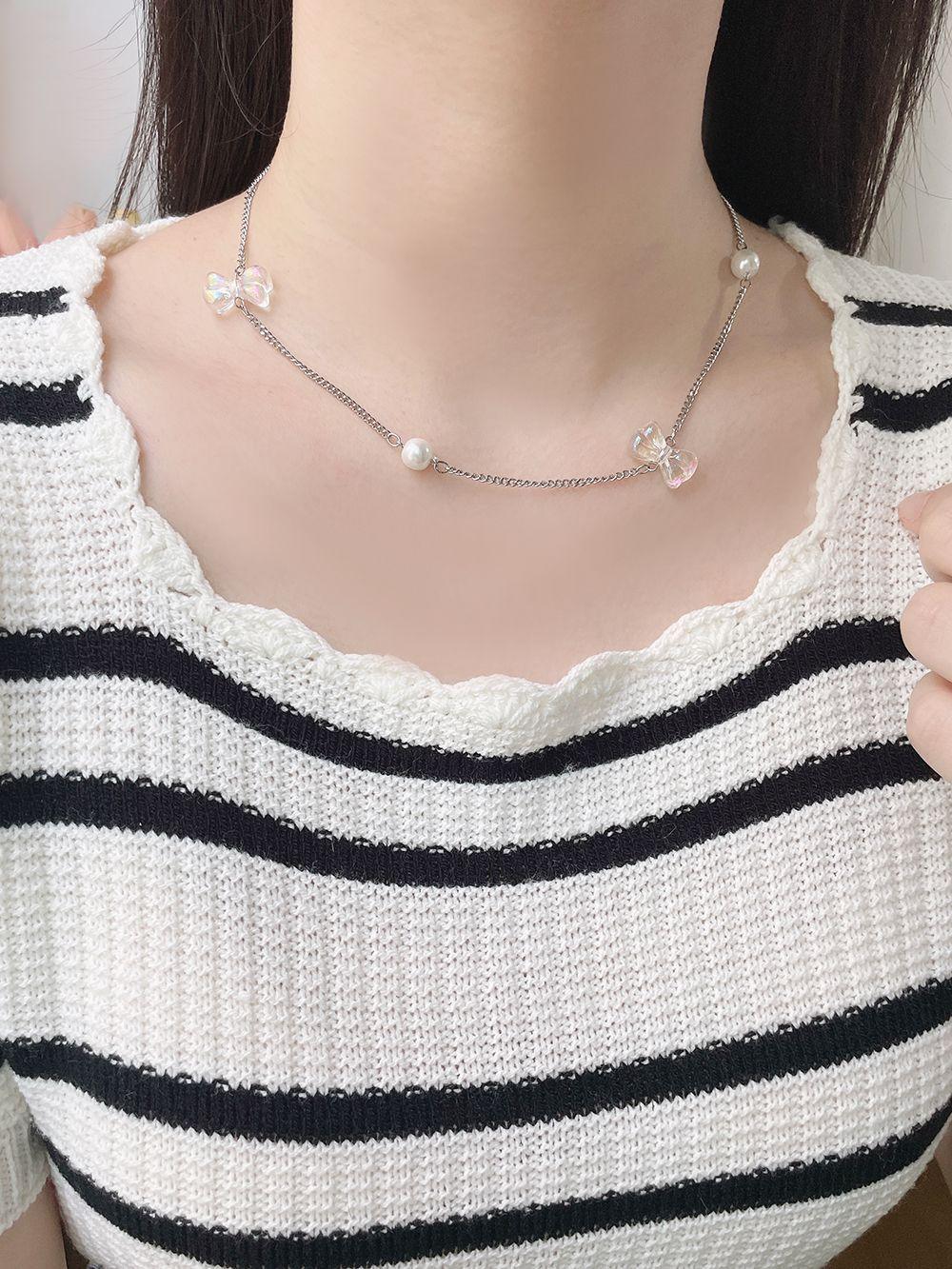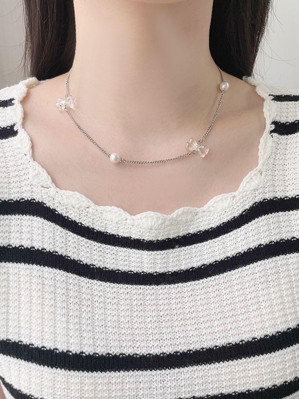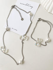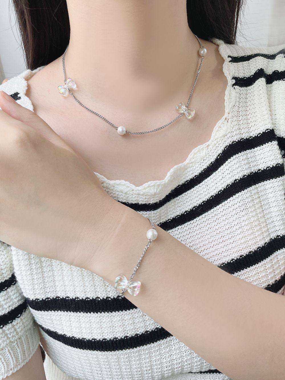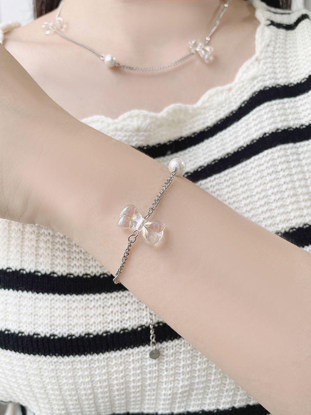 It's a necklace and bracelet with a cool design featuring a surgical steel chain and acrylic ribbon and pearls in the middle :)