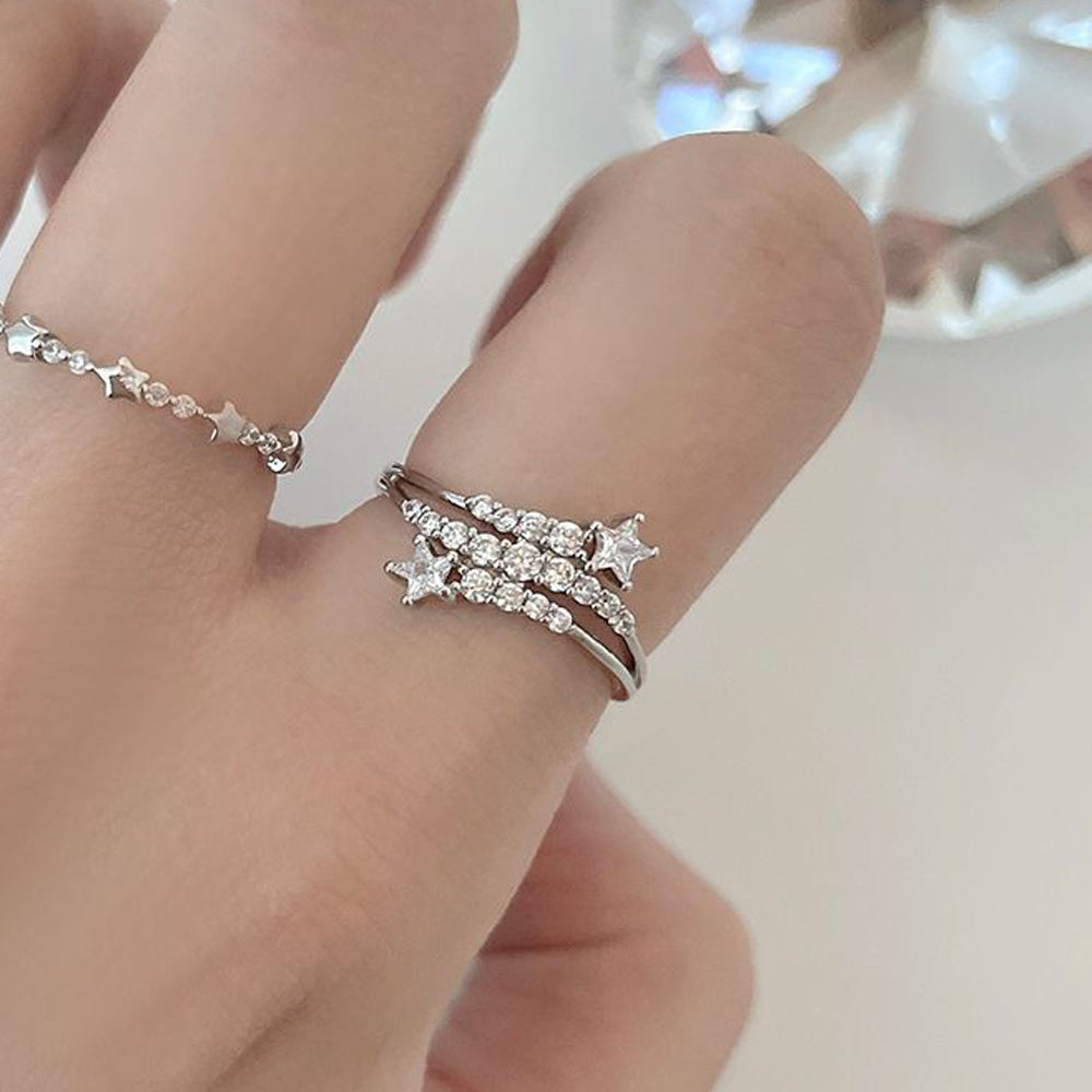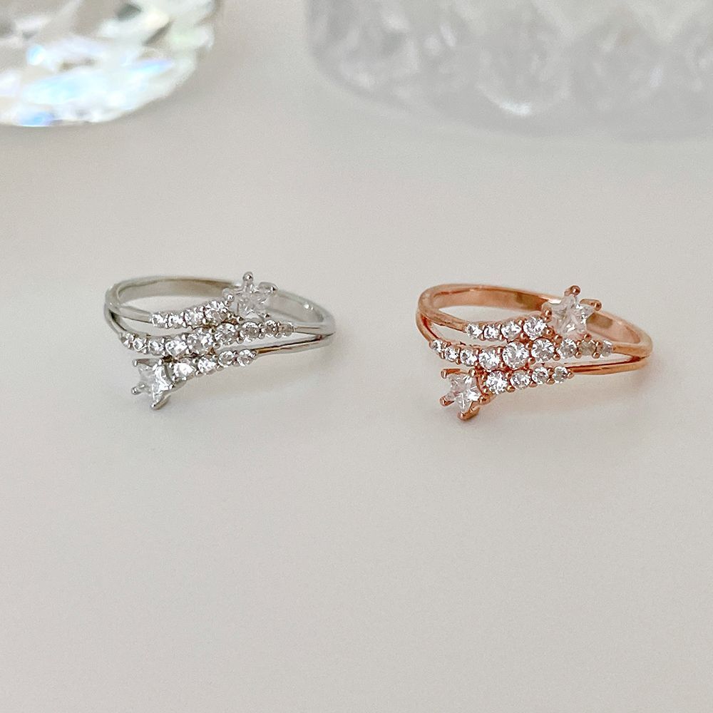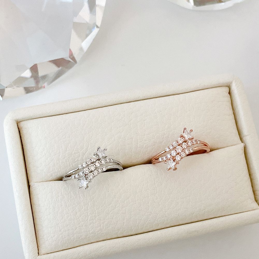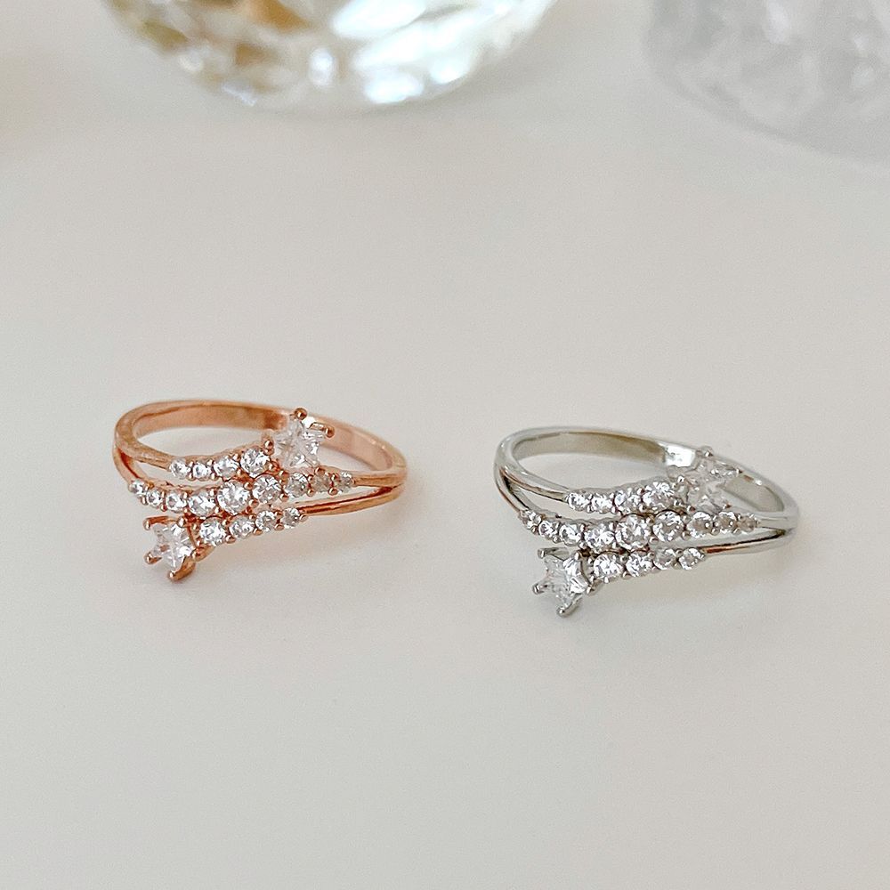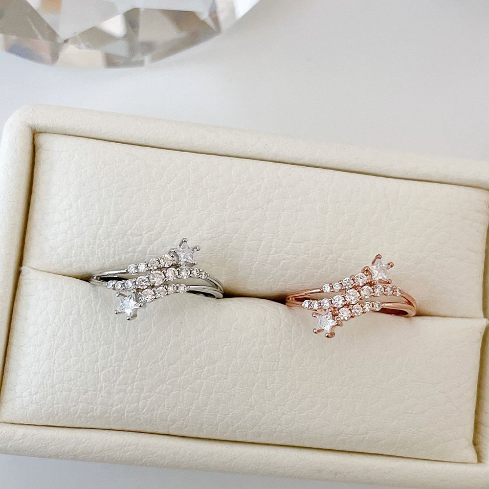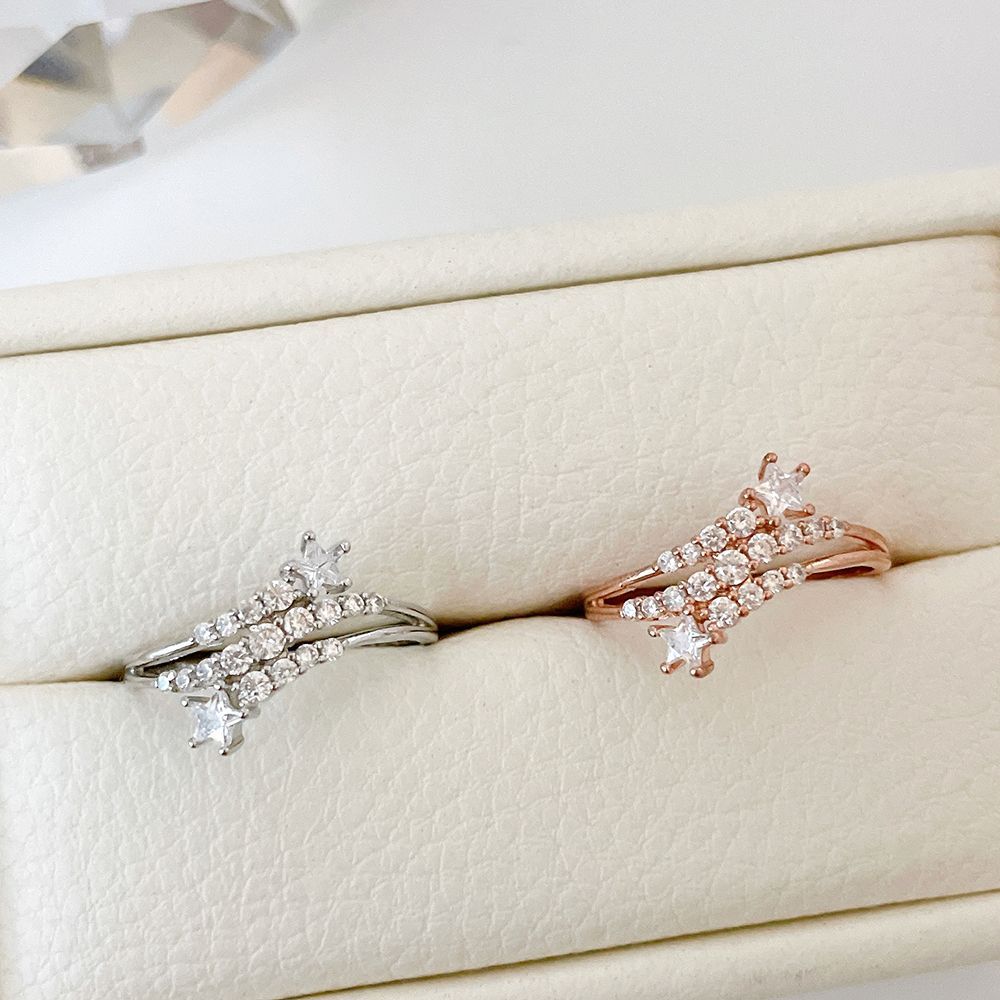 แหวน 2 วงที่มีตัวเรือนทรงลูกบาศก์และจุดสียุคสมัย เพิ่มรายละเอียดรูปดาวที่ตรงกลางเพื่อเน้นผลิตภัณฑ์อย่างละเอียดอ่อน หากคุณเปิดแหวนกว้างเกินไป รูปทรงยุคสมัยและลูกบาศก์อาจหลุดออกมา ดังนั้นเราขอแนะนำให้ปรับเฉพาะด้านหลังเท่านั้น