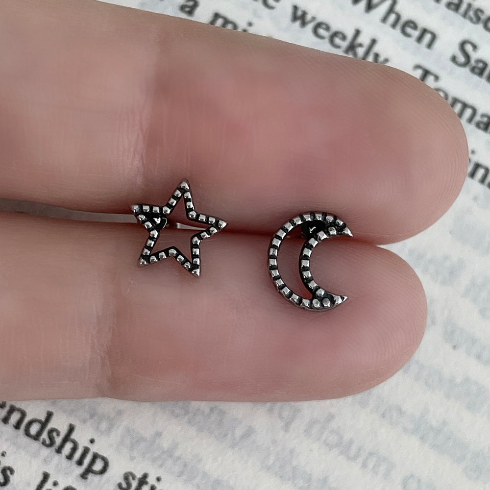 星と月のアウトラインに沿って、ラインで描いたようなデザインのバーベルピアスです。