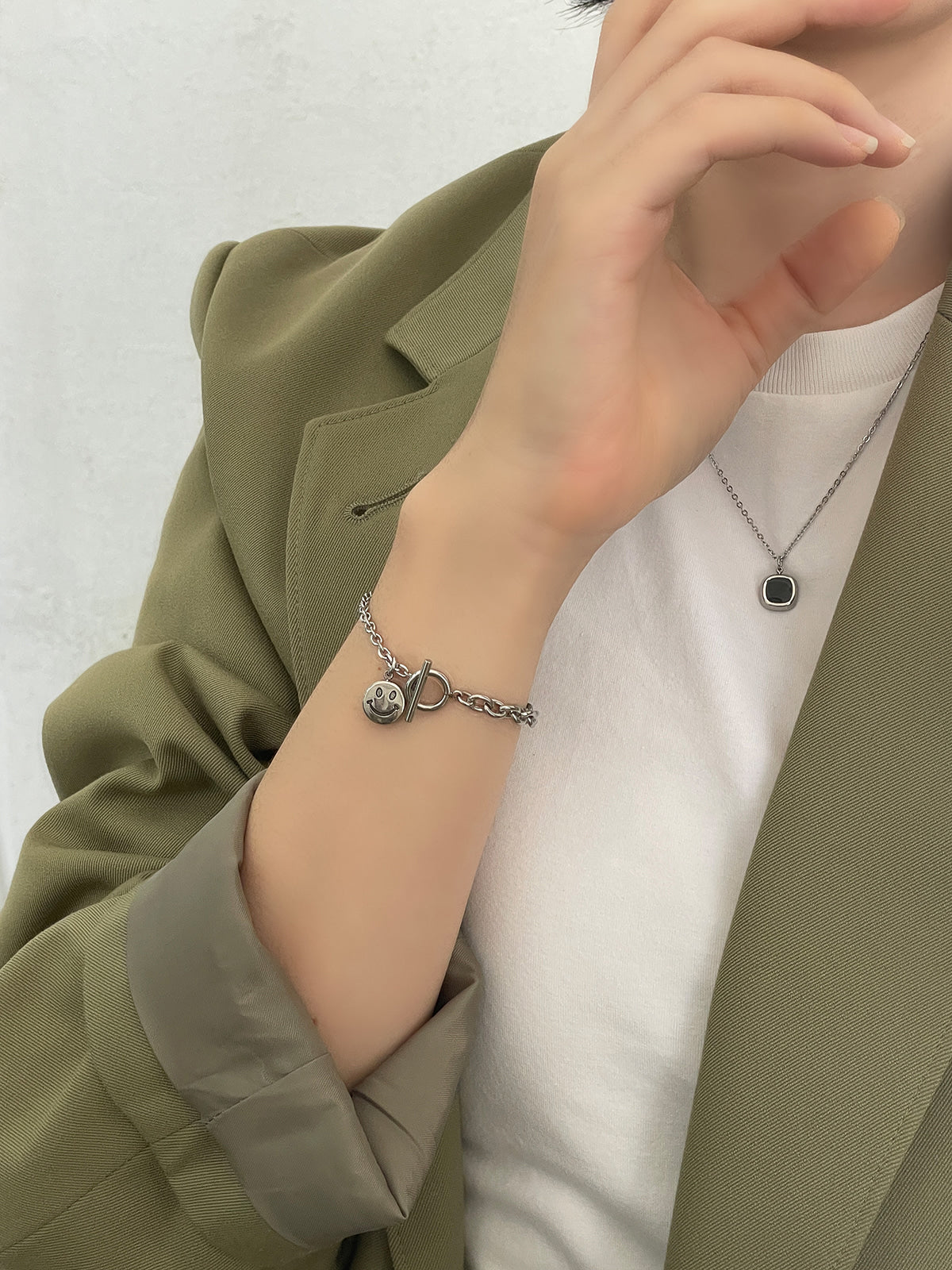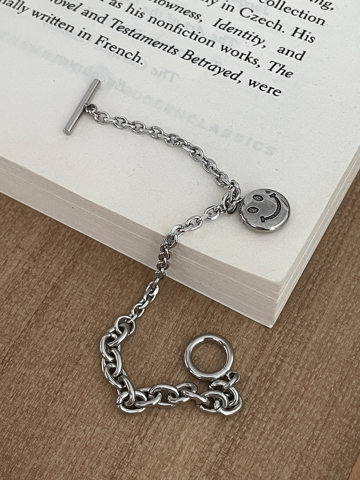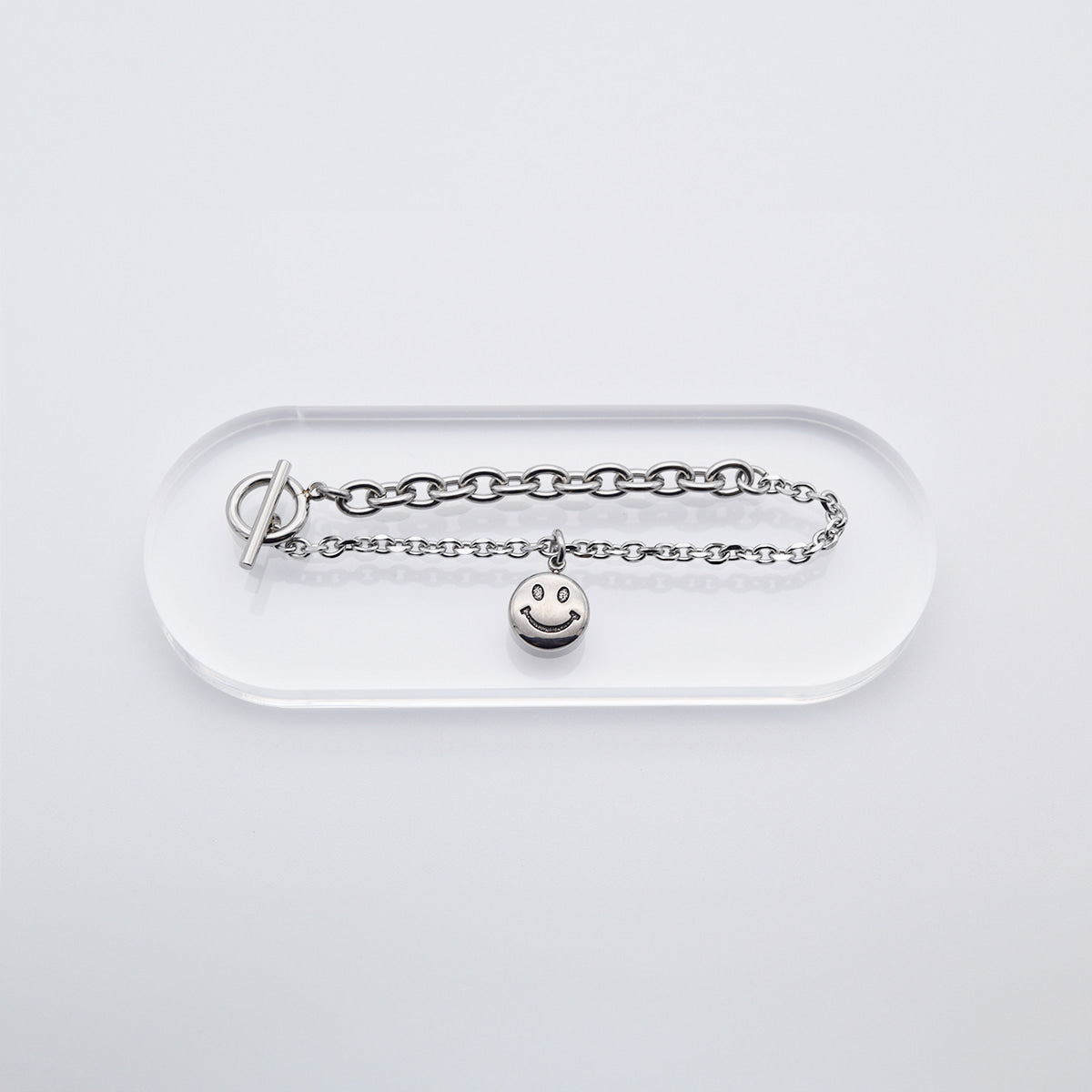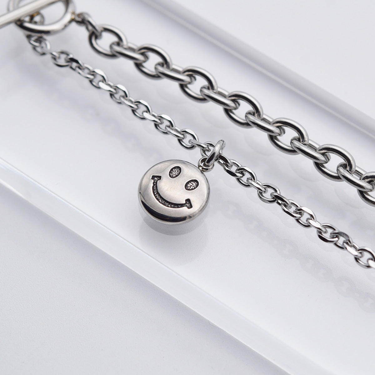 2種類のチェーンラインとスマイルチャームがバランスよく組み合わされたアンバランスチェーンブレスレットです。シンプルなシルバーカラーにさりげないスマイルのワンポイントを加えることで、軽やかで洗練されたムードを演出します。ユニークなアシンメトリー構成で、単体使いでもスタイリングのアクセントとして存在感を放ちます。