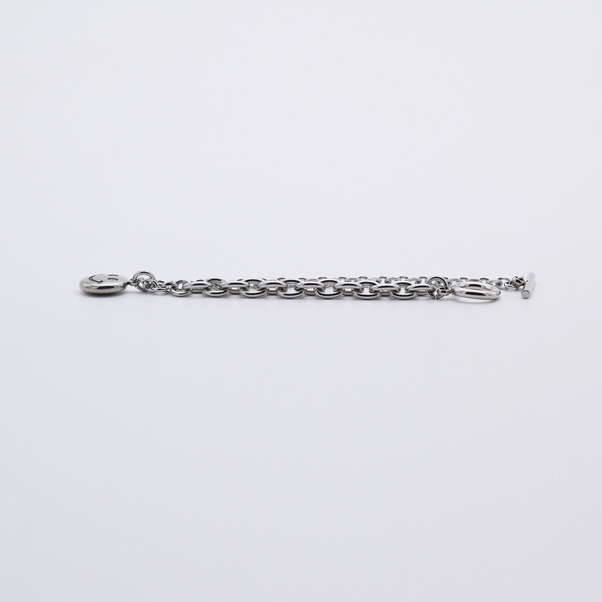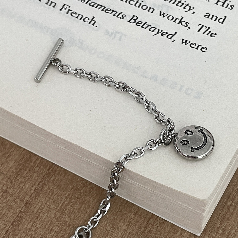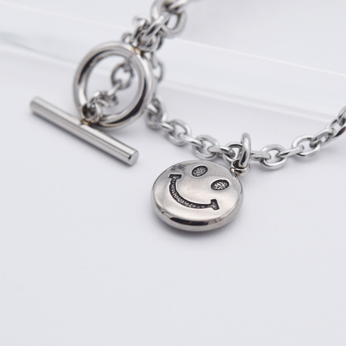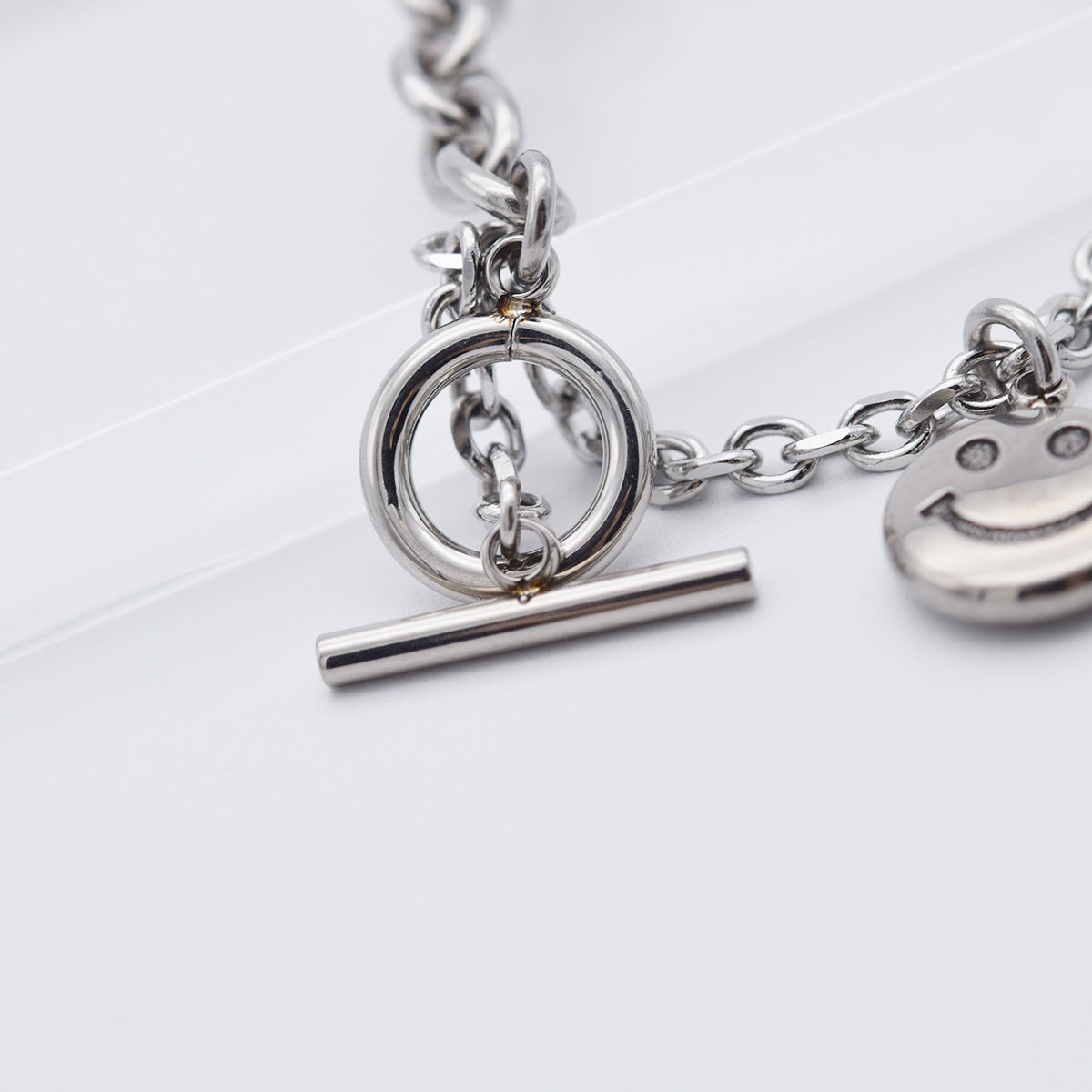 2種類のチェーンラインとスマイルチャームがバランスよく組み合わされたアンバランスチェーンブレスレットです。シンプルなシルバーカラーにさりげないスマイルのワンポイントを加えることで、軽やかで洗練されたムードを演出します。ユニークなアシンメトリー構成で、単体使いでもスタイリングのアクセントとして存在感を放ちます。