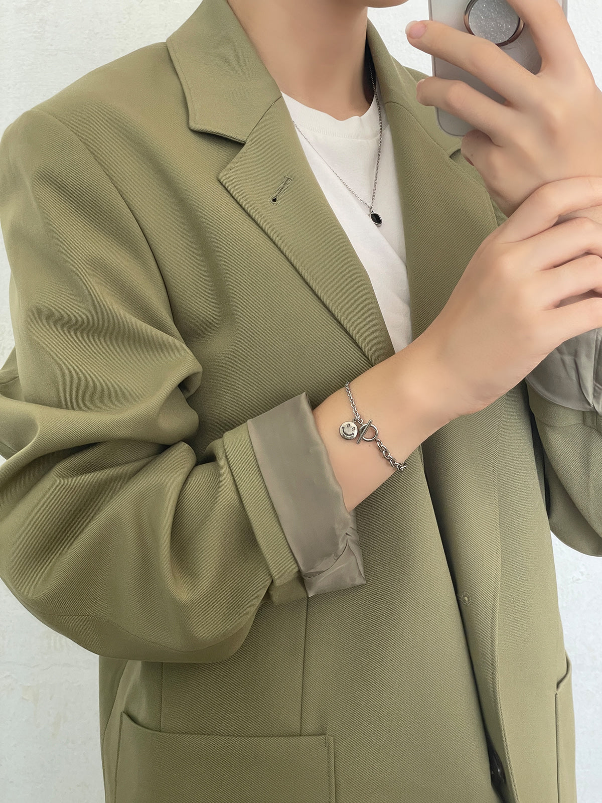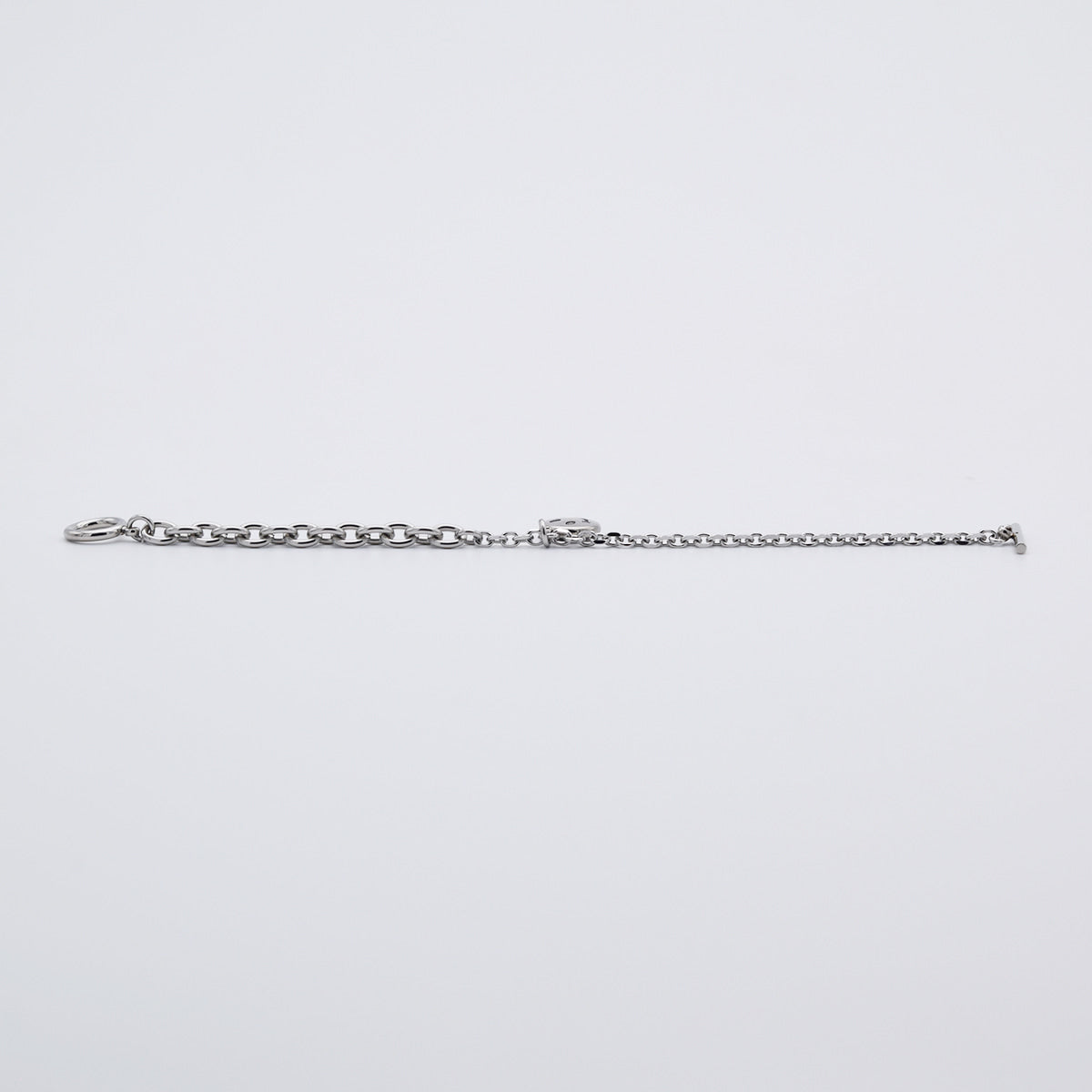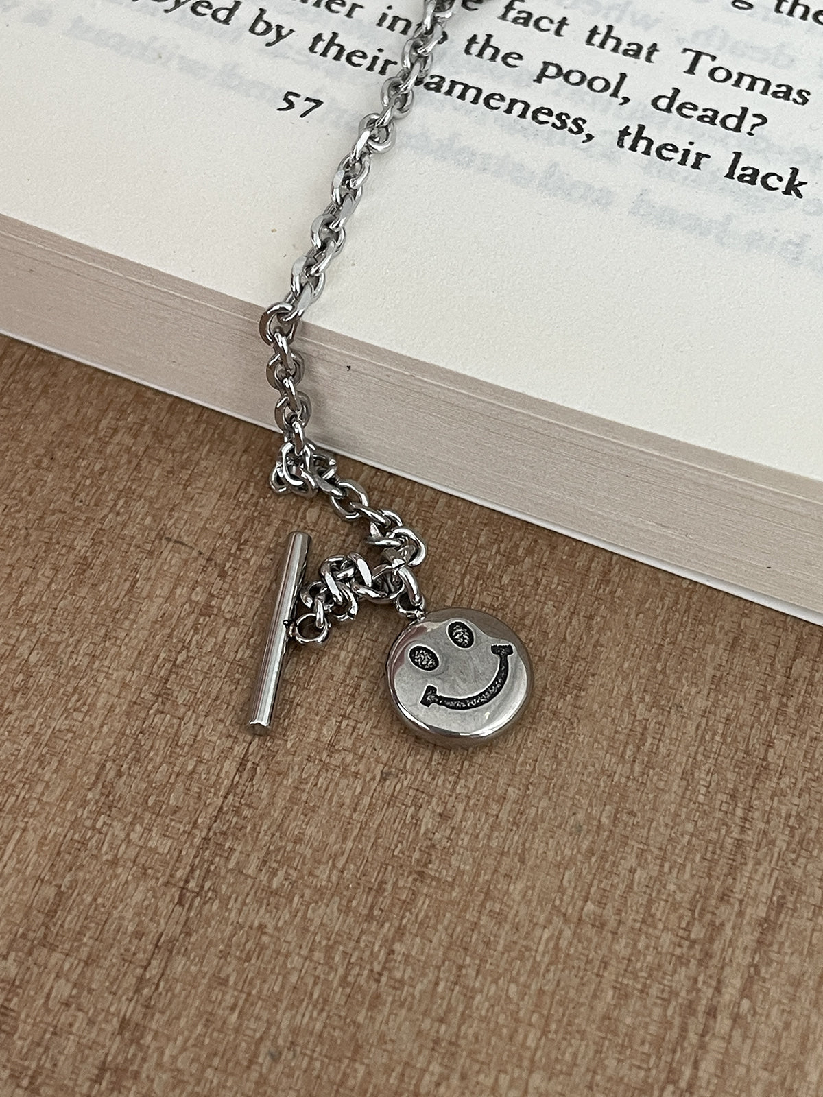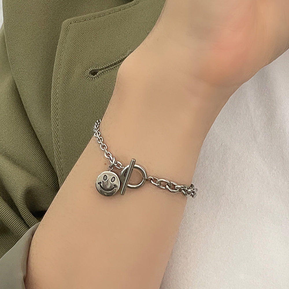 2種類のチェーンラインとスマイルチャームがバランスよく組み合わされたアンバランスチェーンブレスレットです。シンプルなシルバーカラーにさりげないスマイルのワンポイントを加えることで、軽やかで洗練されたムードを演出します。ユニークなアシンメトリー構成で、単体使いでもスタイリングのアクセントとして存在感を放ちます。