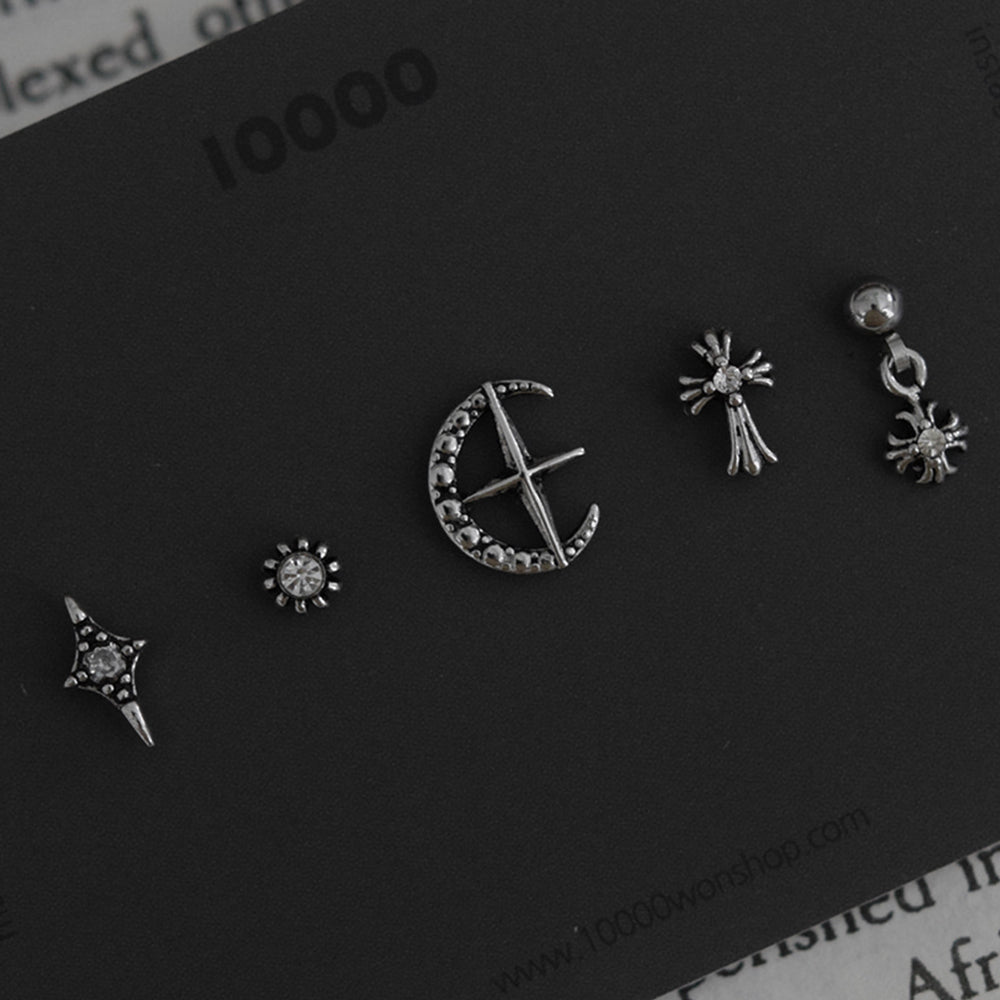 [5個セット][サージカル]アンティーク ムーンクロスピアスセット16G ボディピアス 三日月 スター
