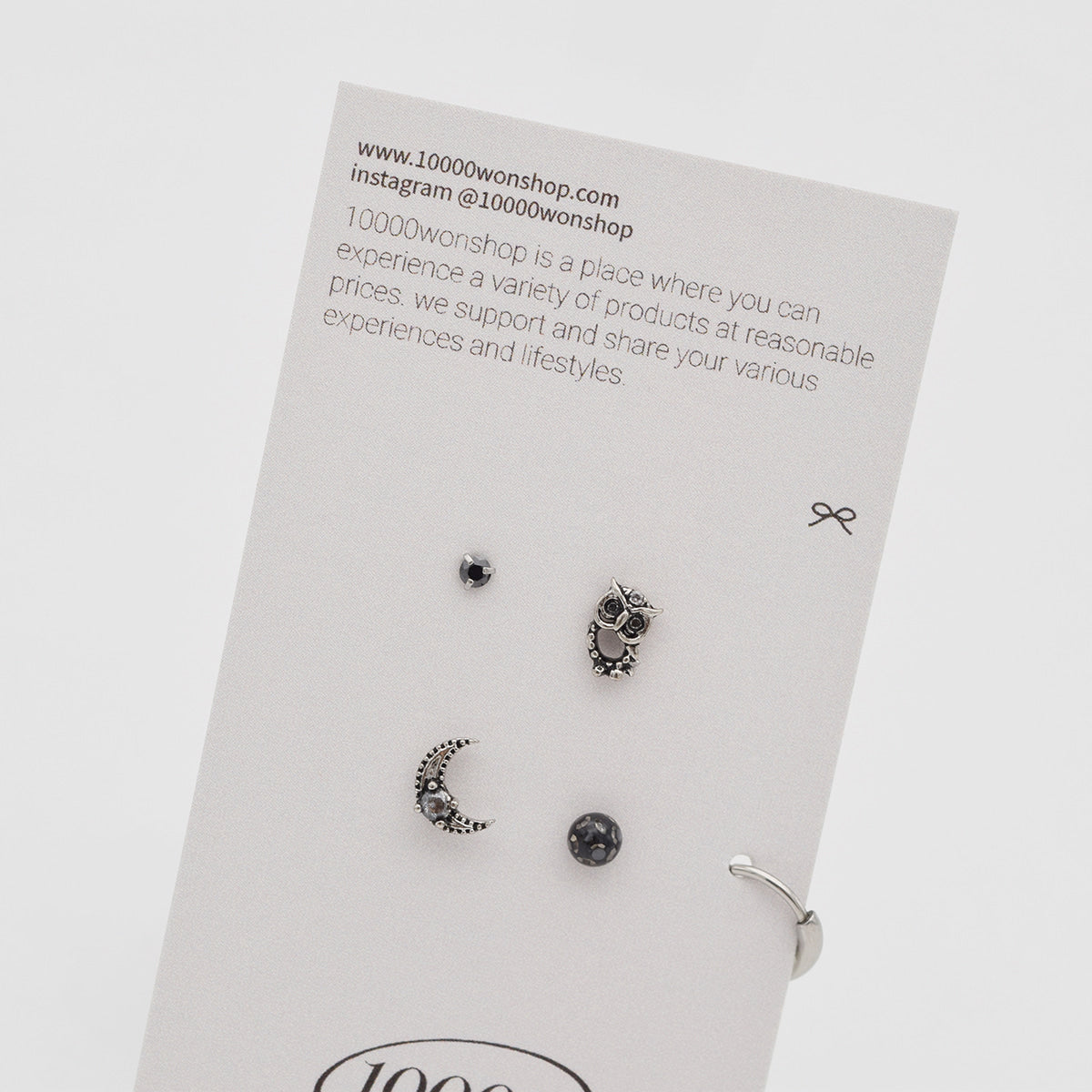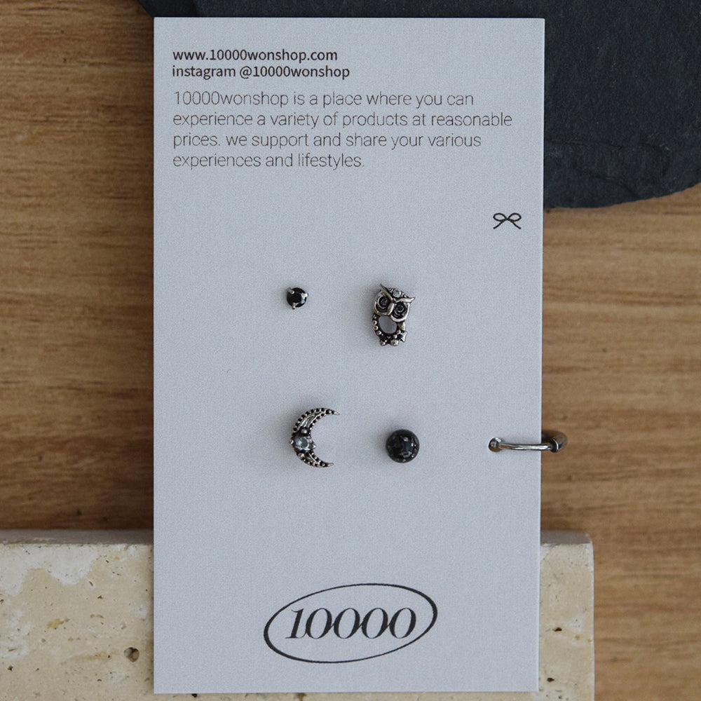 月明かりの下に座っているようなアンティーク調のフクロウと三日月、ブラックキュービックが調和したピアスセットです。