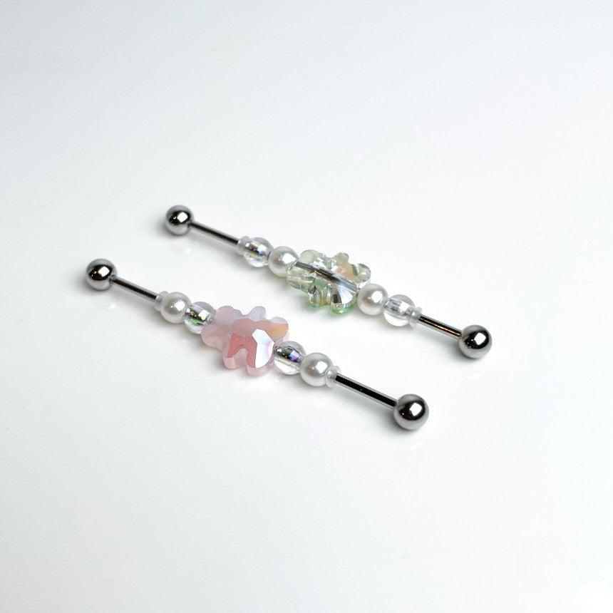 ดีไซน์ต่างหูสไตล์อุตสาหกรรมที่มีเอกลักษณ์เฉพาะตัว ผสมผสานระหว่างหมีสีสันสดใสและสีน้ำนม ลูกบอลโอปอลใส และลูกบอลไข่มุก :)