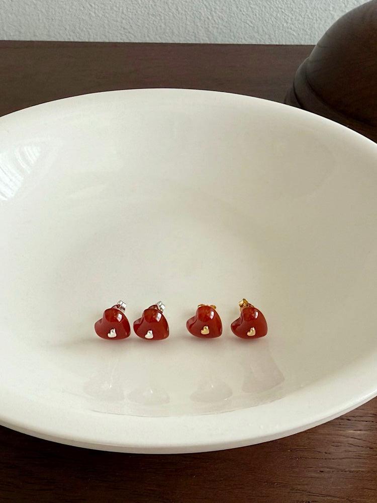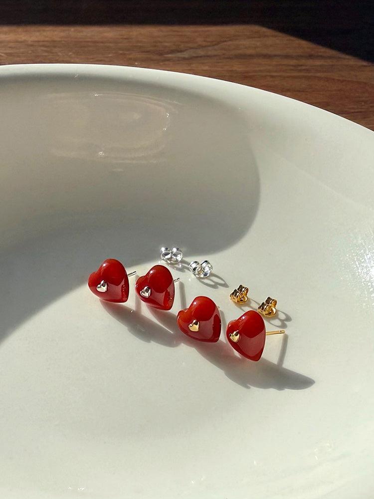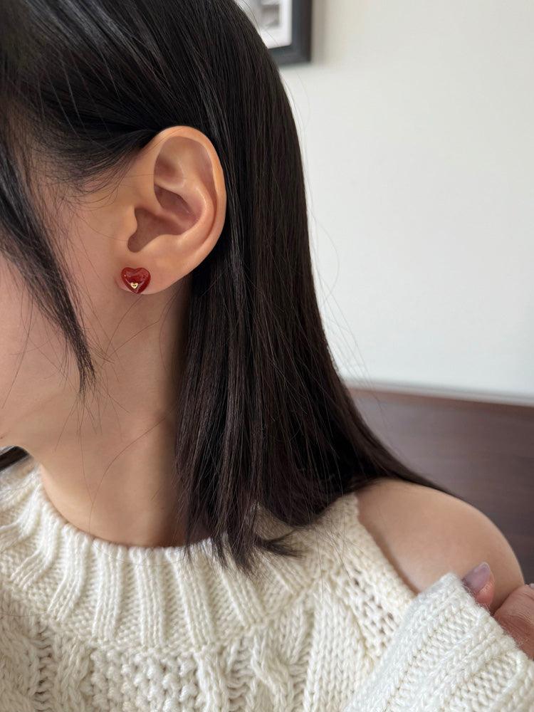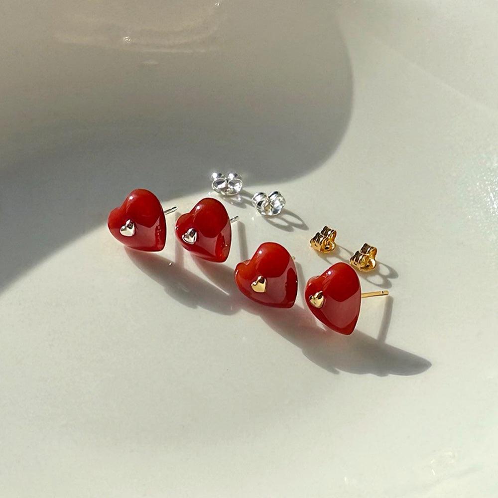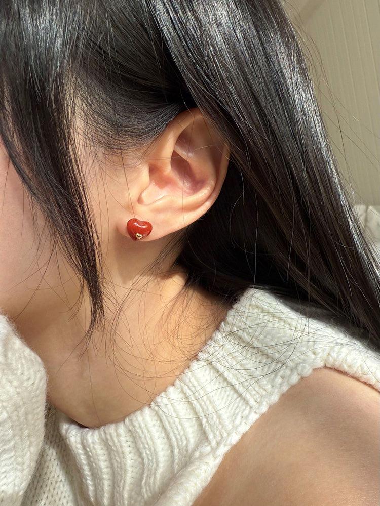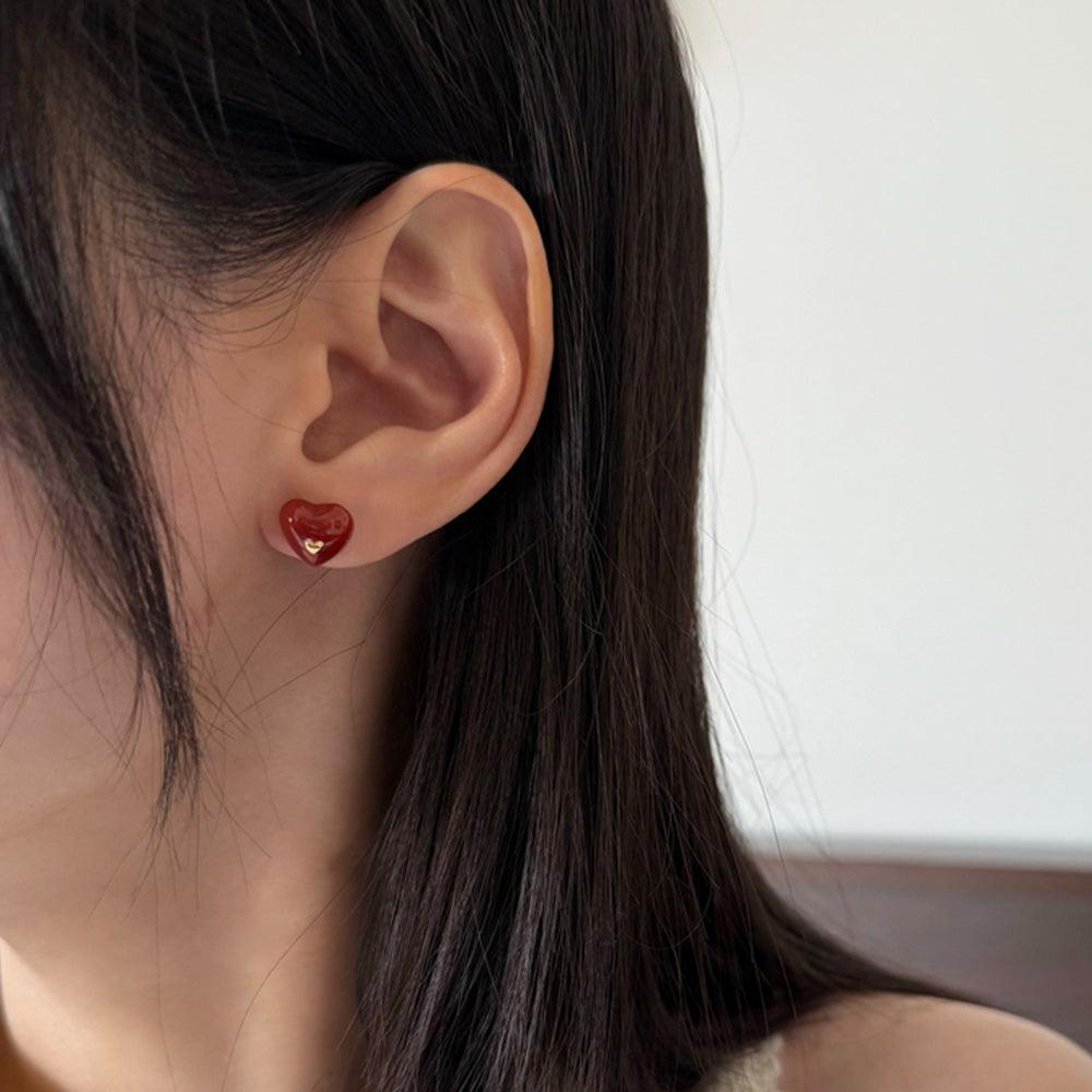 - ต่างหูดีไซน์รูปหัวใจจิ๋วประดับอัญมณีรูปหัวใจสีแดง