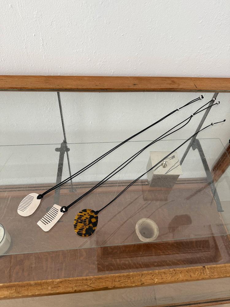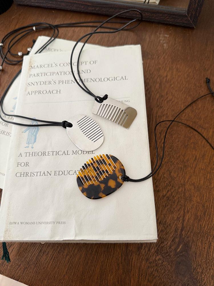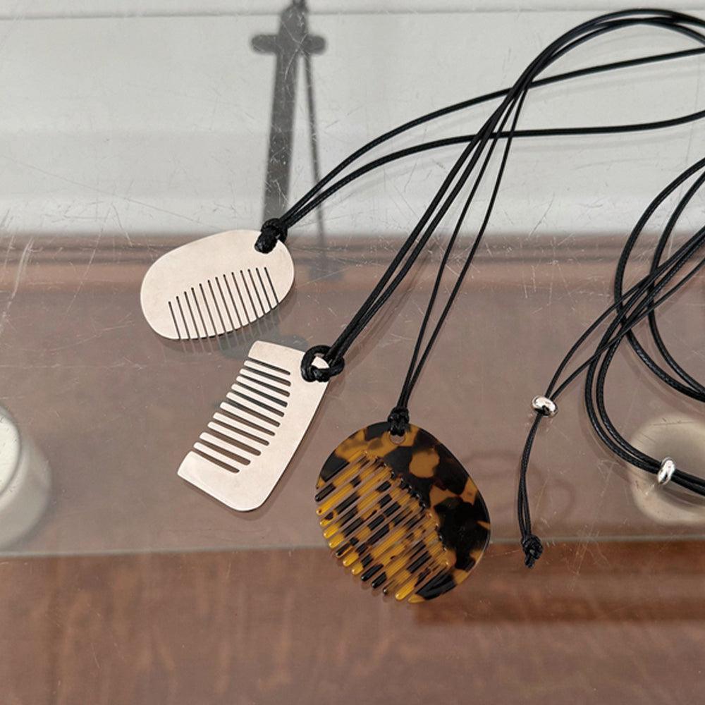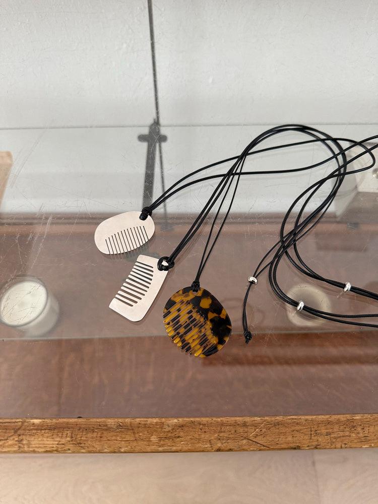 - สร้อยคอพร้อมสายหนังสีดำยาวและจี้หวีโลหะ/ลายเสือดาวที่เข้ากัน