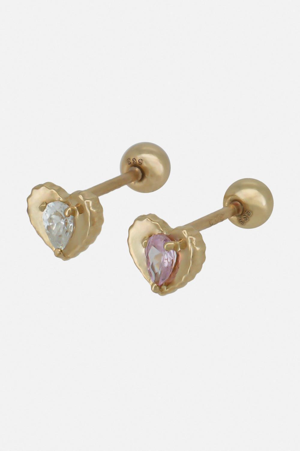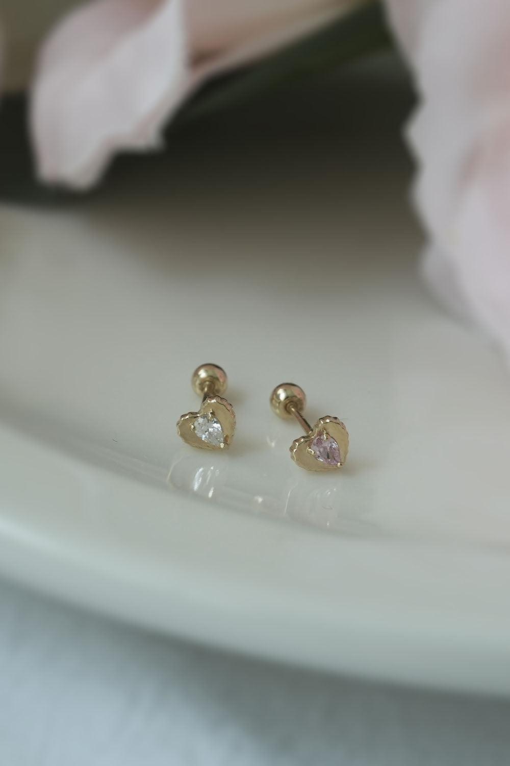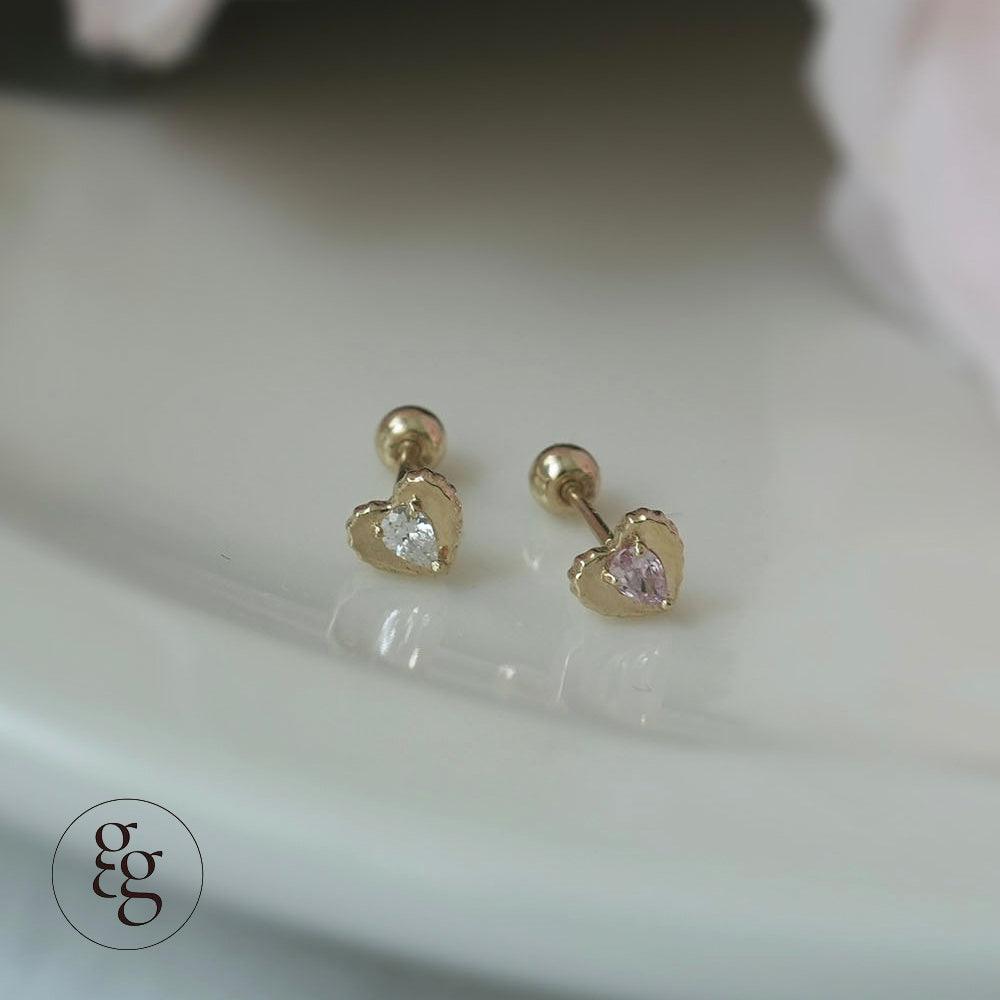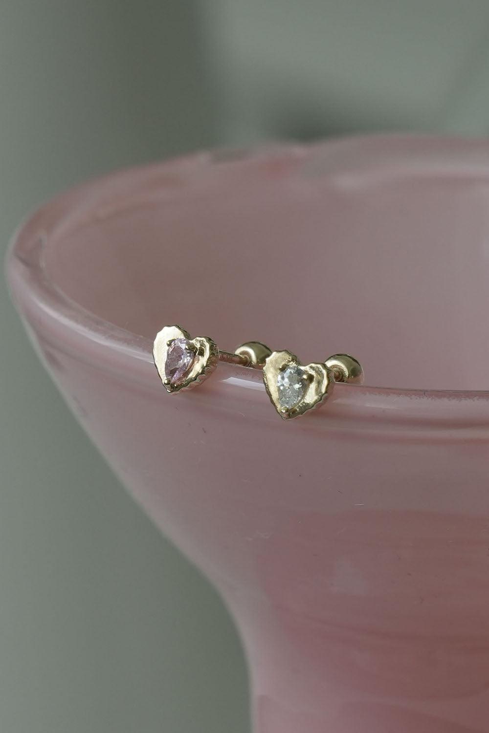 ต่างหูรูปหัวใจคู่นี้มีรายละเอียดพื้นผิวขรุขระบนขอบหนาและมีเพชรคิวบิกเซอร์โคเนียประดับอยู่ตรงกลาง