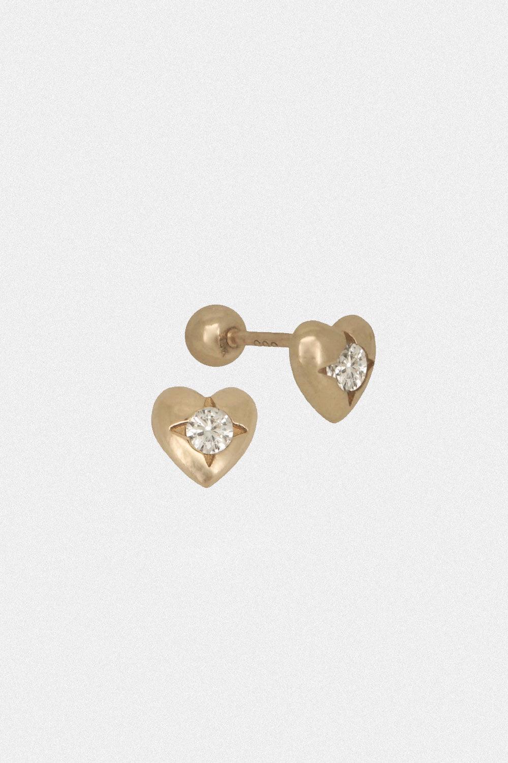 ต่างหูคู่นี้มีรูปทรงหัวใจอวบสามมิติพร้อมด้วยเพชรคิวบิกเซอร์โคเนียทรงกลมที่เจียระไนเป็นรูปไม้กางเขนตรงกลาง